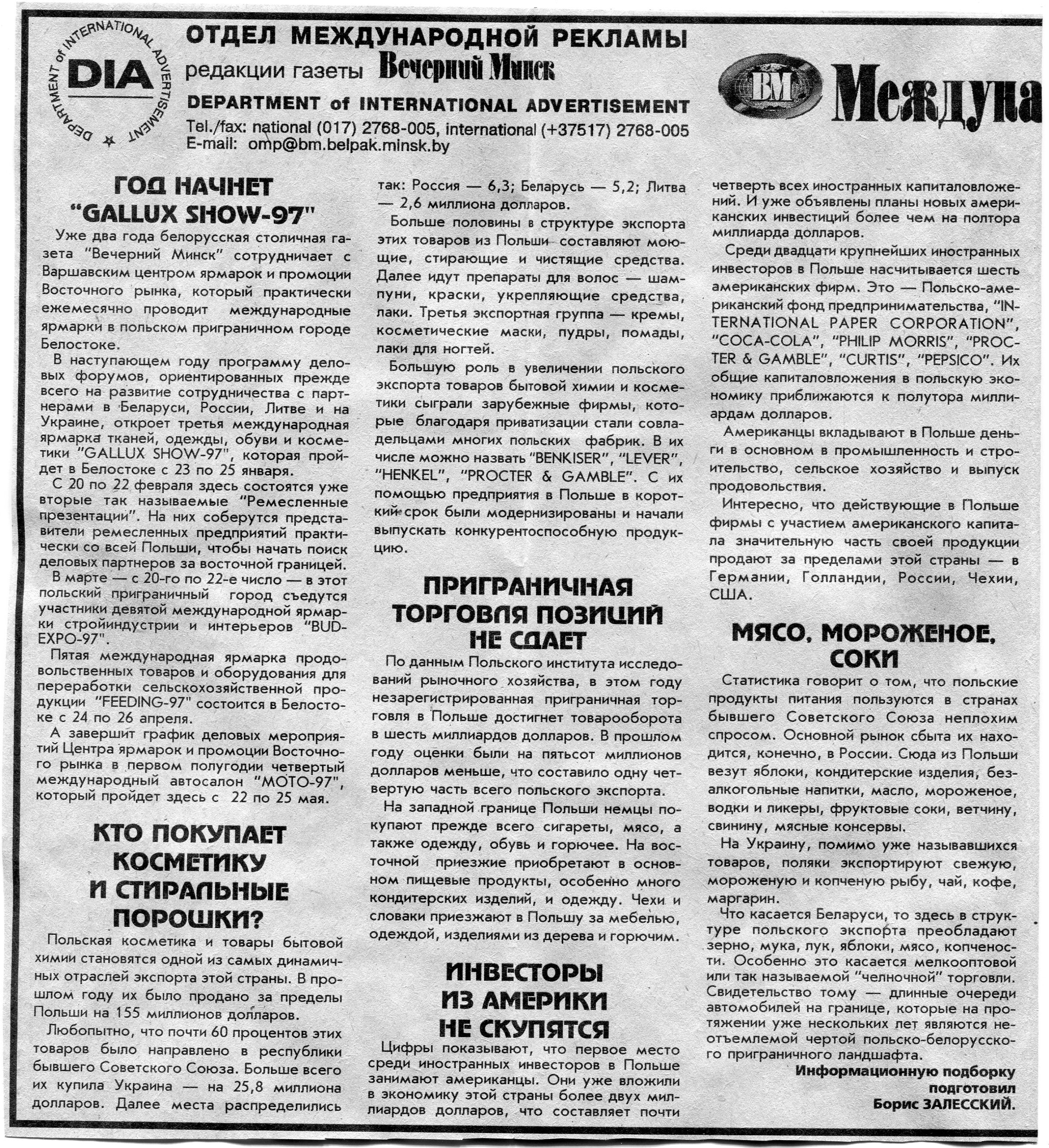 Залесский, Б. Новая газета на польском рынке информации и рекламы / Б. Залесский // Вечерний Минск. - 1996. - 27 дек.