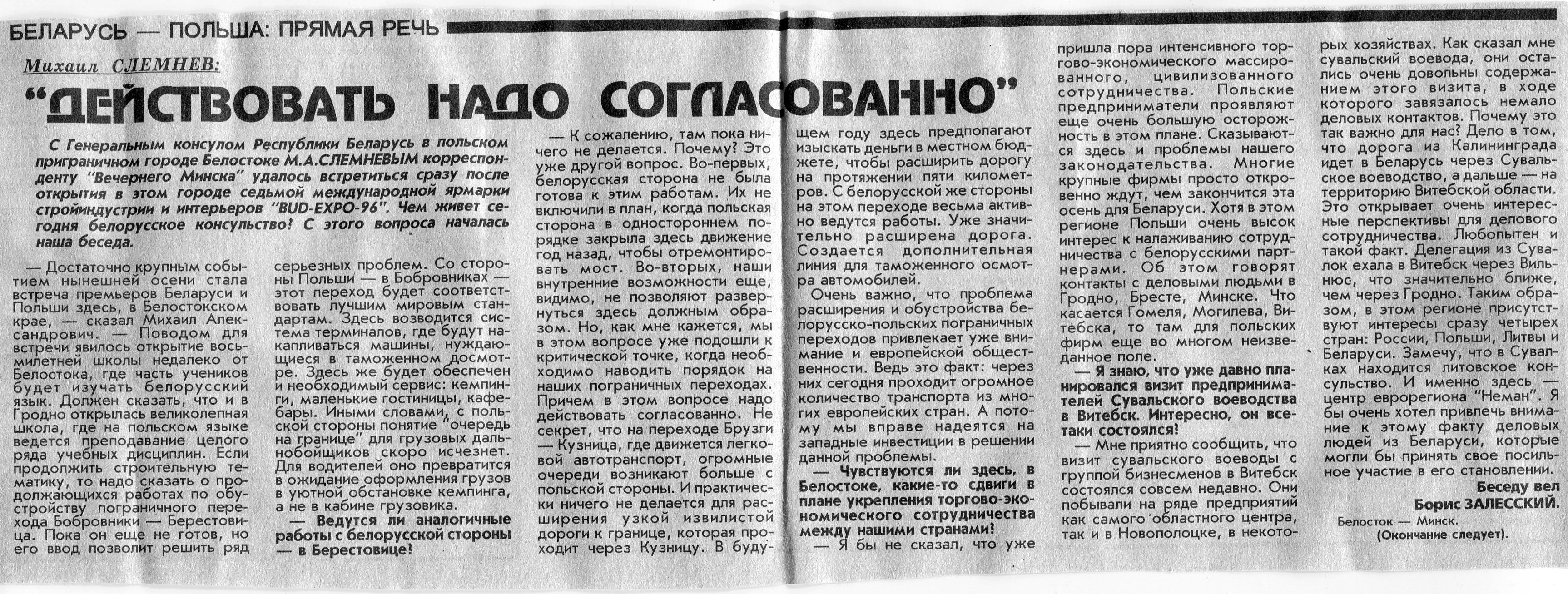 Залесский, Б. Михаил Слемнев: "Действовать надо согласованно" (2) / Б. Залесский // Вечерний Минск. - 1996. - 4 нояб.