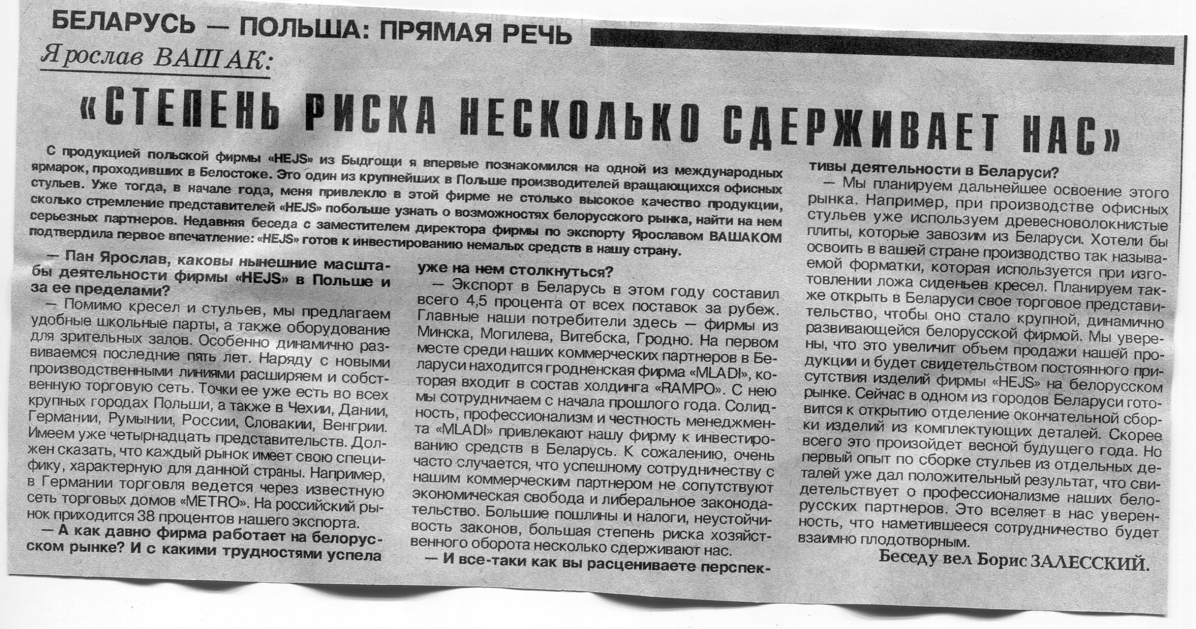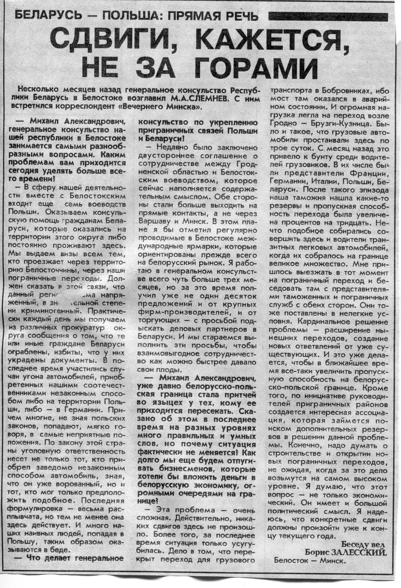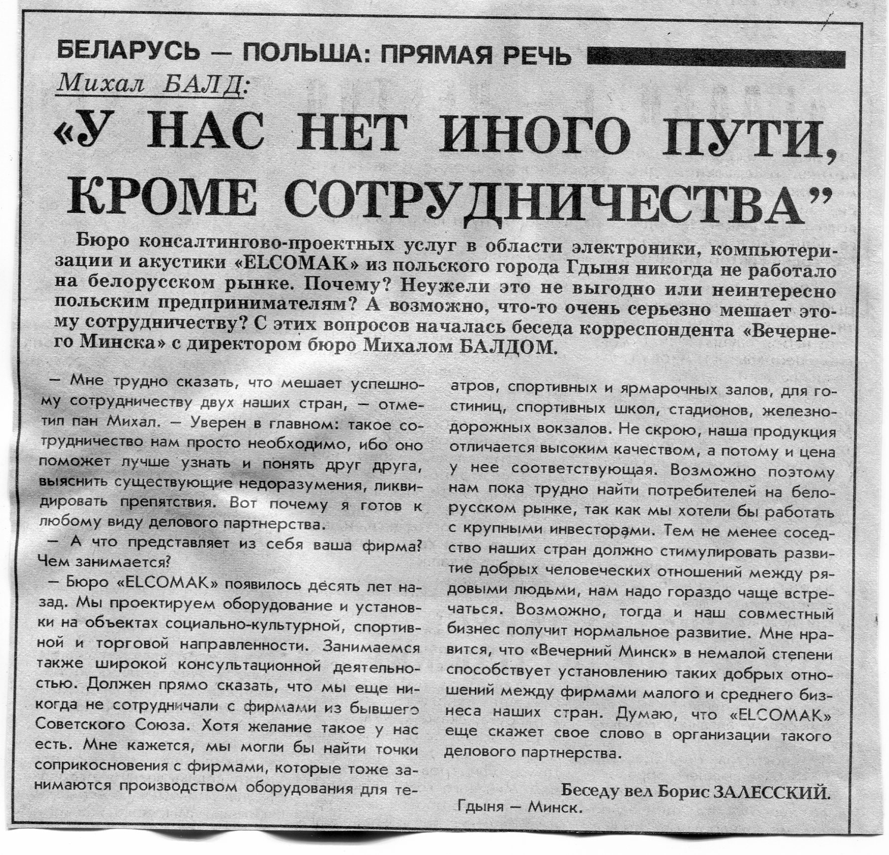 Залесский, Б. Михал Балд: "У нас нет иного пути, кроме сотрудничества" / Б. Залесский // Вечерний Минск. - 1995. - 19 окт.