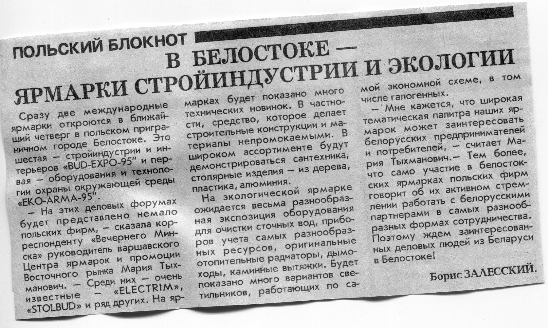 Залесский, Б. 1. Ярмарки в Белостоке - путь к сотрудничеству / Б. Залесский // Вечерний Минск. - 1995. - 3 нояб.
