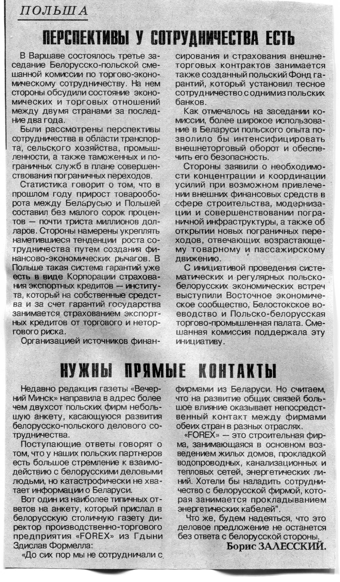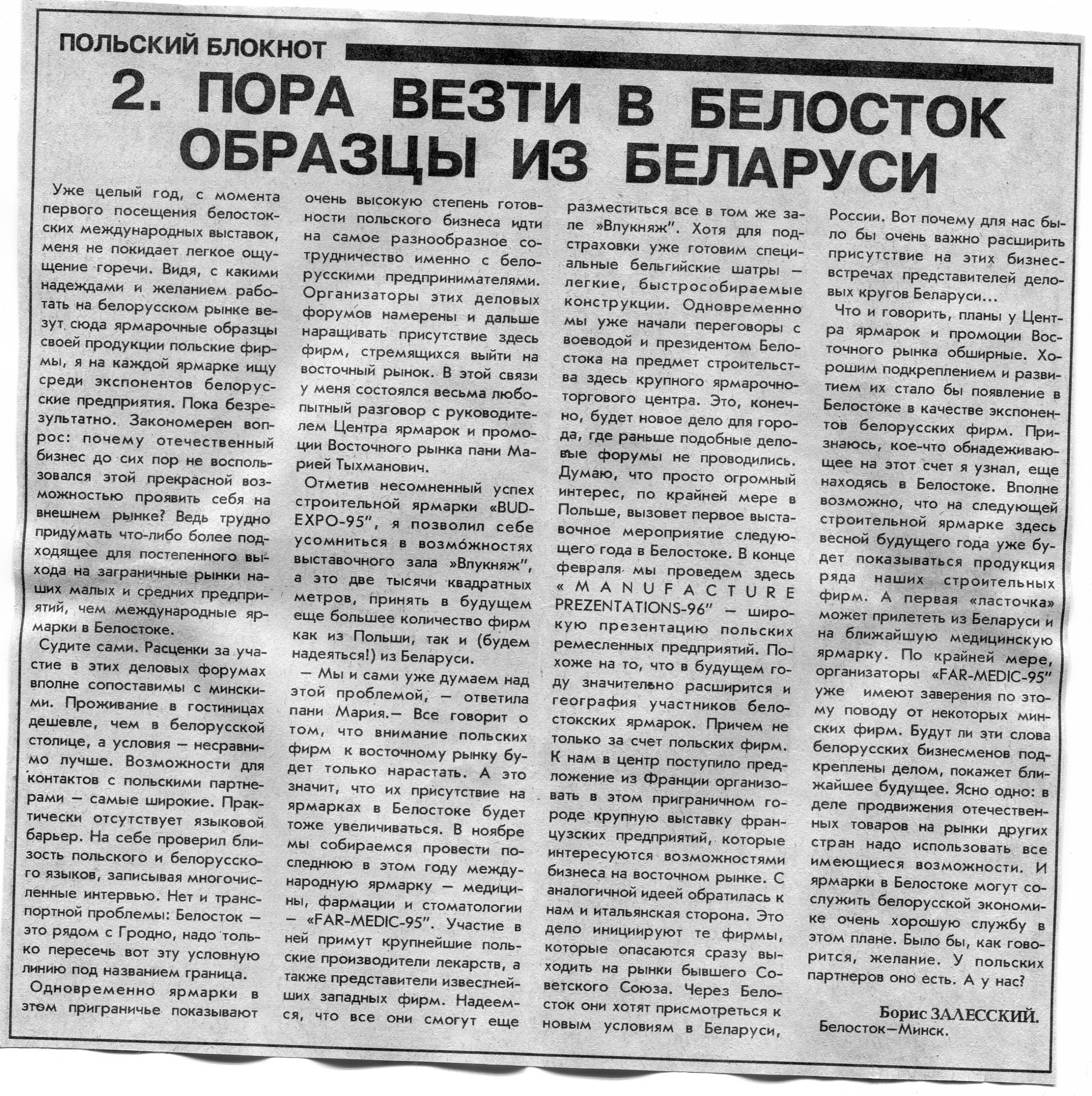 Залесский, Б. 2. Пора везти в Белосток образцы из Беларуси / Б. Залесский // Вечерний Минск. - 1995. - 8 нояб.