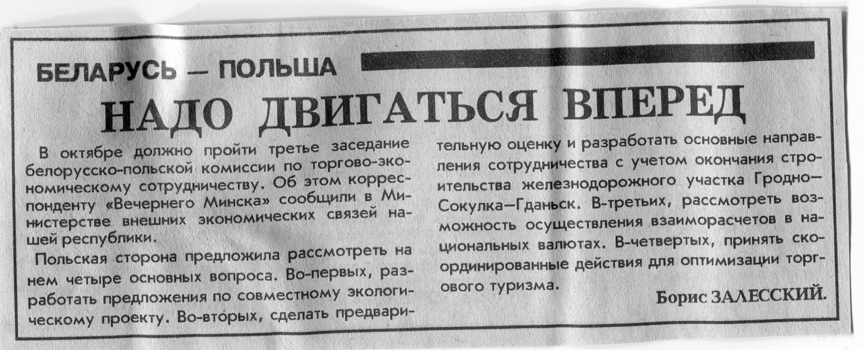 Залесский, Б. Надо двигаться вперед / Б. Залесский // Вечерний Минск. - 1995. - 11 окт.