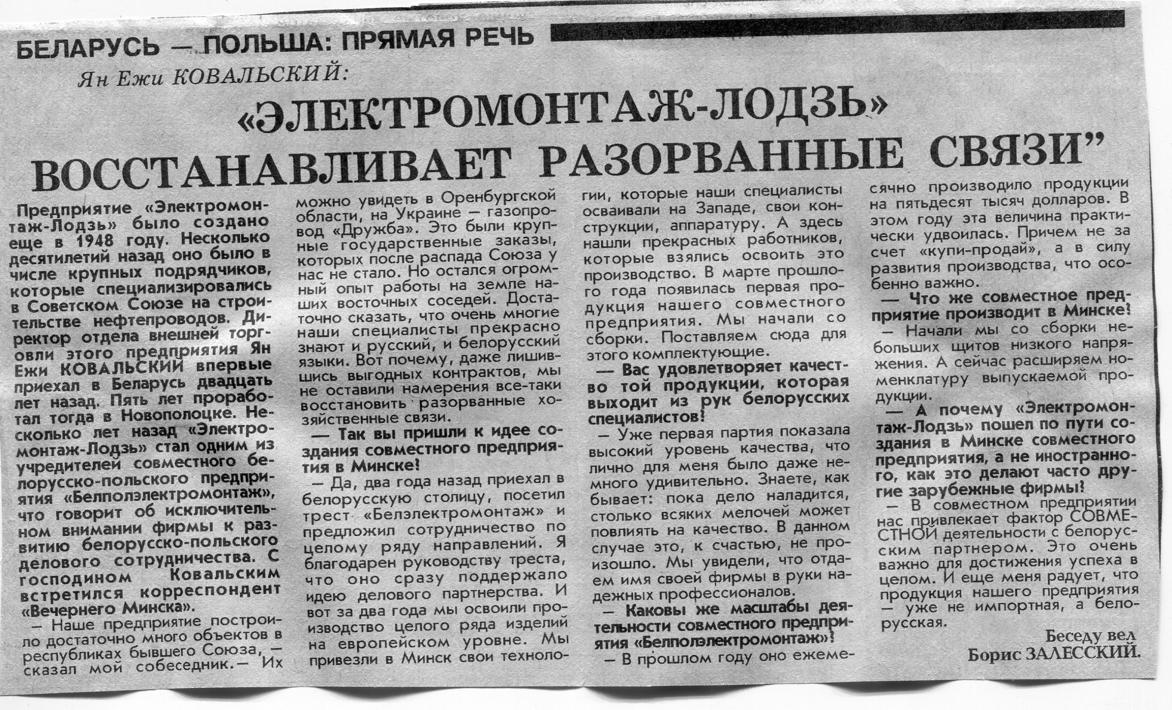Залесский, Б. Ян Ежи Ковальский: "Электромонтаж-Лодзь" восстанавливает разорванные связи" / Б. Залесский // Вечерний Минск. - 1995. - 4 окт.