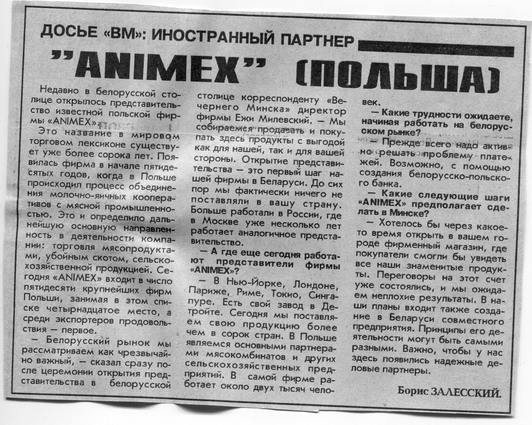 Залесский, Б. "Animex" (Польша) / Б. Залесский // Вечерний Минск. - 1995. - 23 окт.