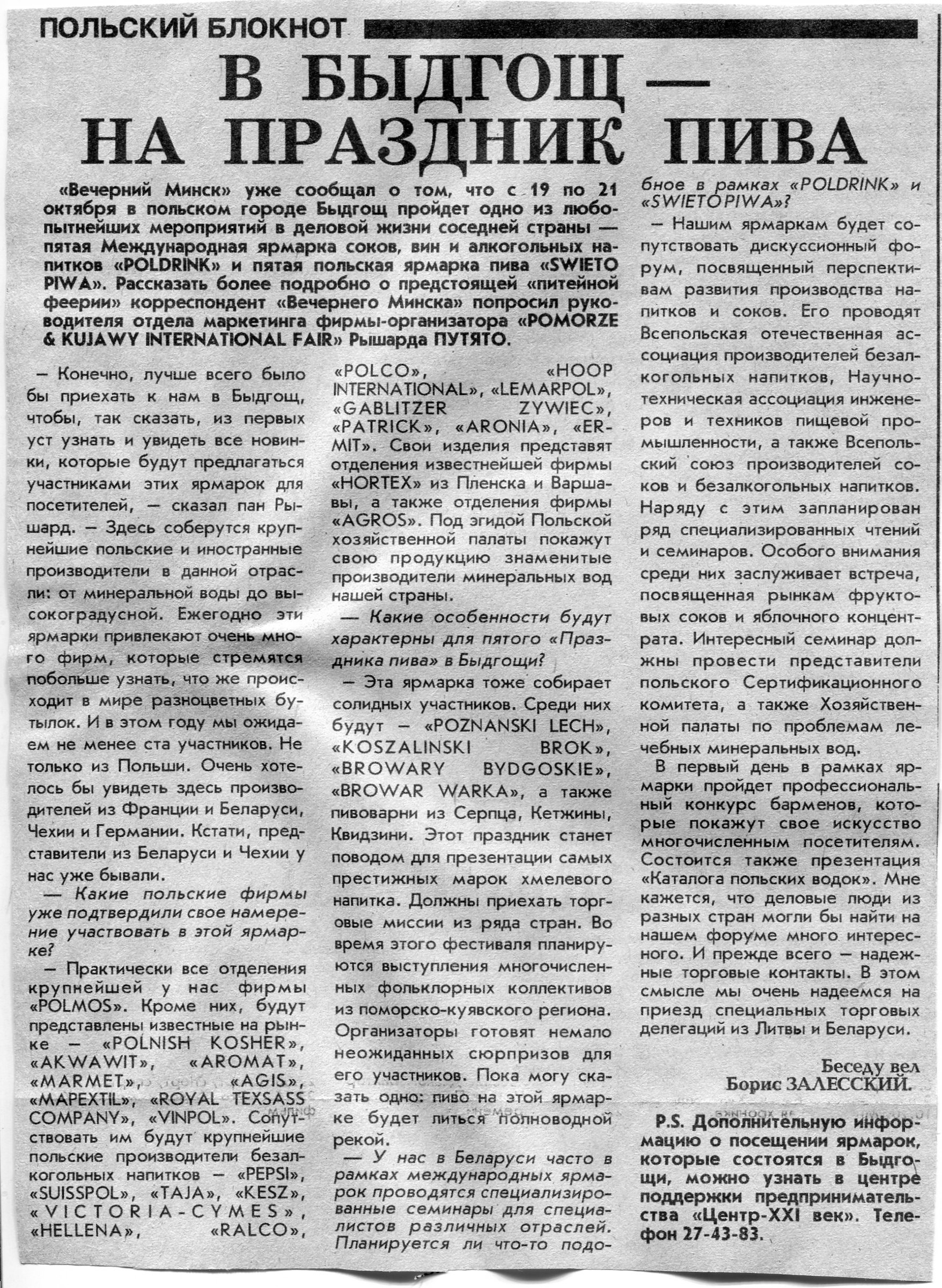 Залесский, Б. В Быдгощ - на праздник пива / Б. Залесский // Вечерний Минск. - 1995. - 29 сент.