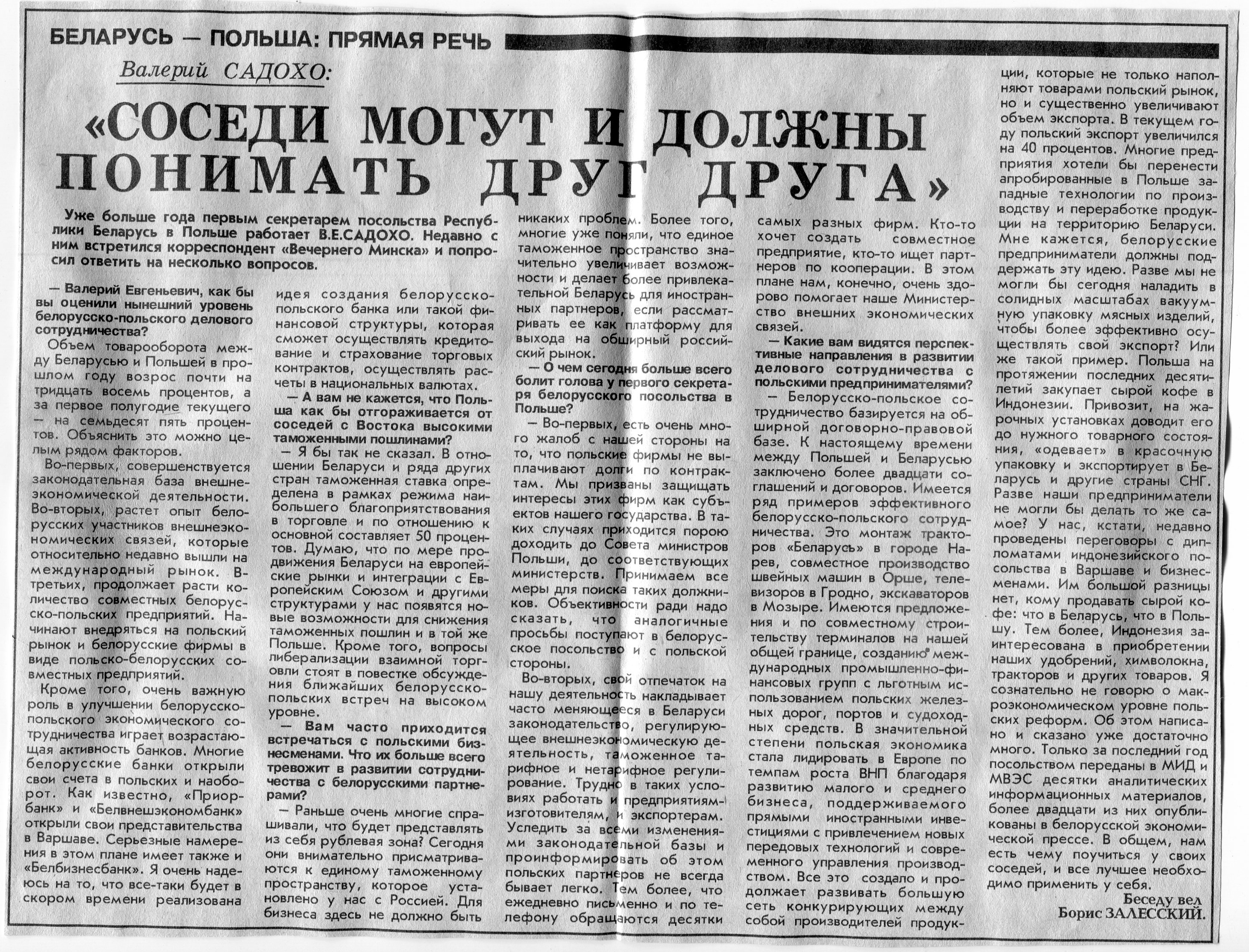 Залесский, Б. Валерий Садохо: "Соседи могут и должны понимать друг друга" / Б. Залесский // Вечерний Минск. - 1995. - 8 сент.