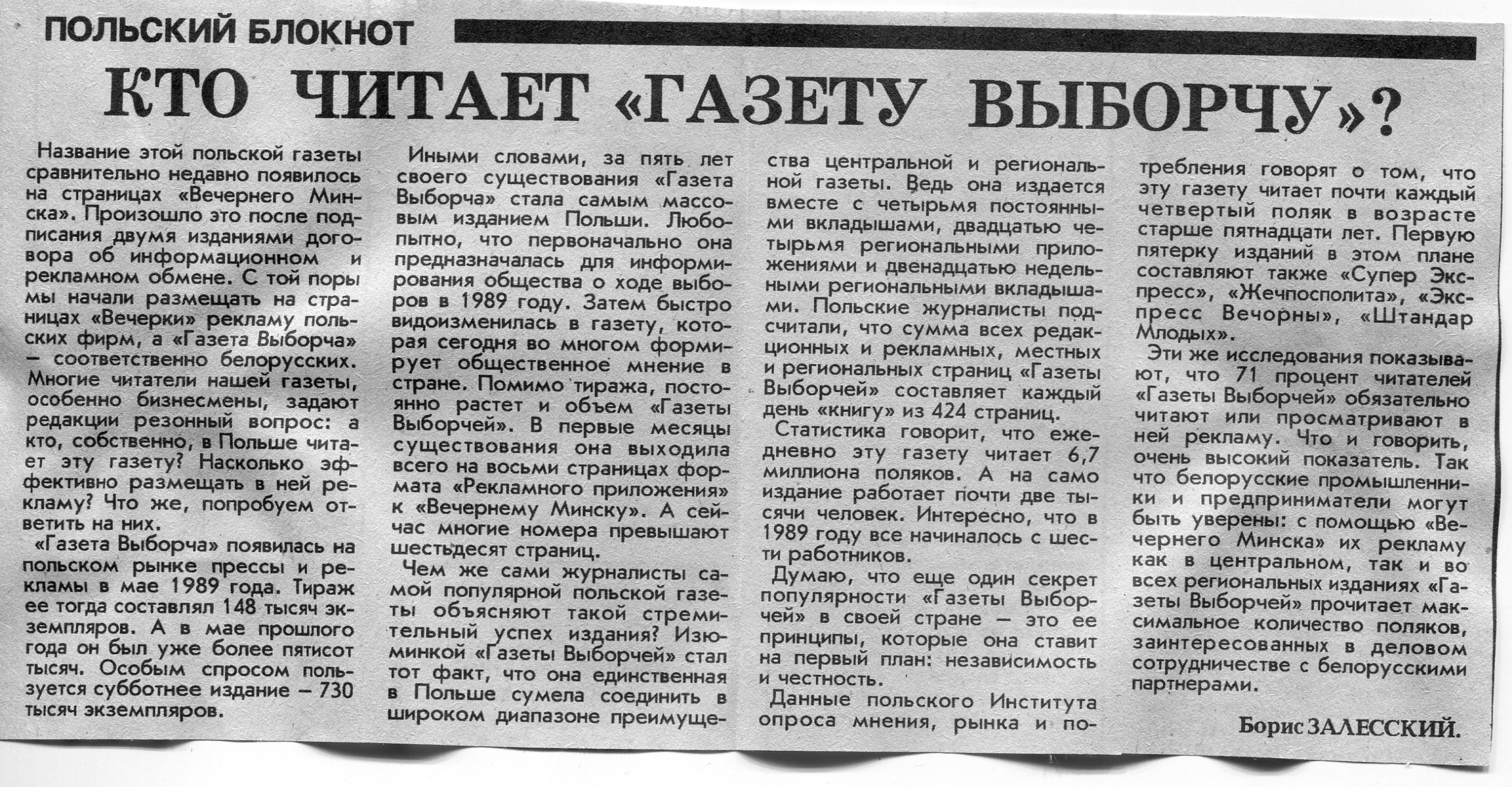 Залесский, Б. Кто читает "Газету Выборчу"? / Б. Залесский // Вечерний Минск. - 1995. - 18 июл.