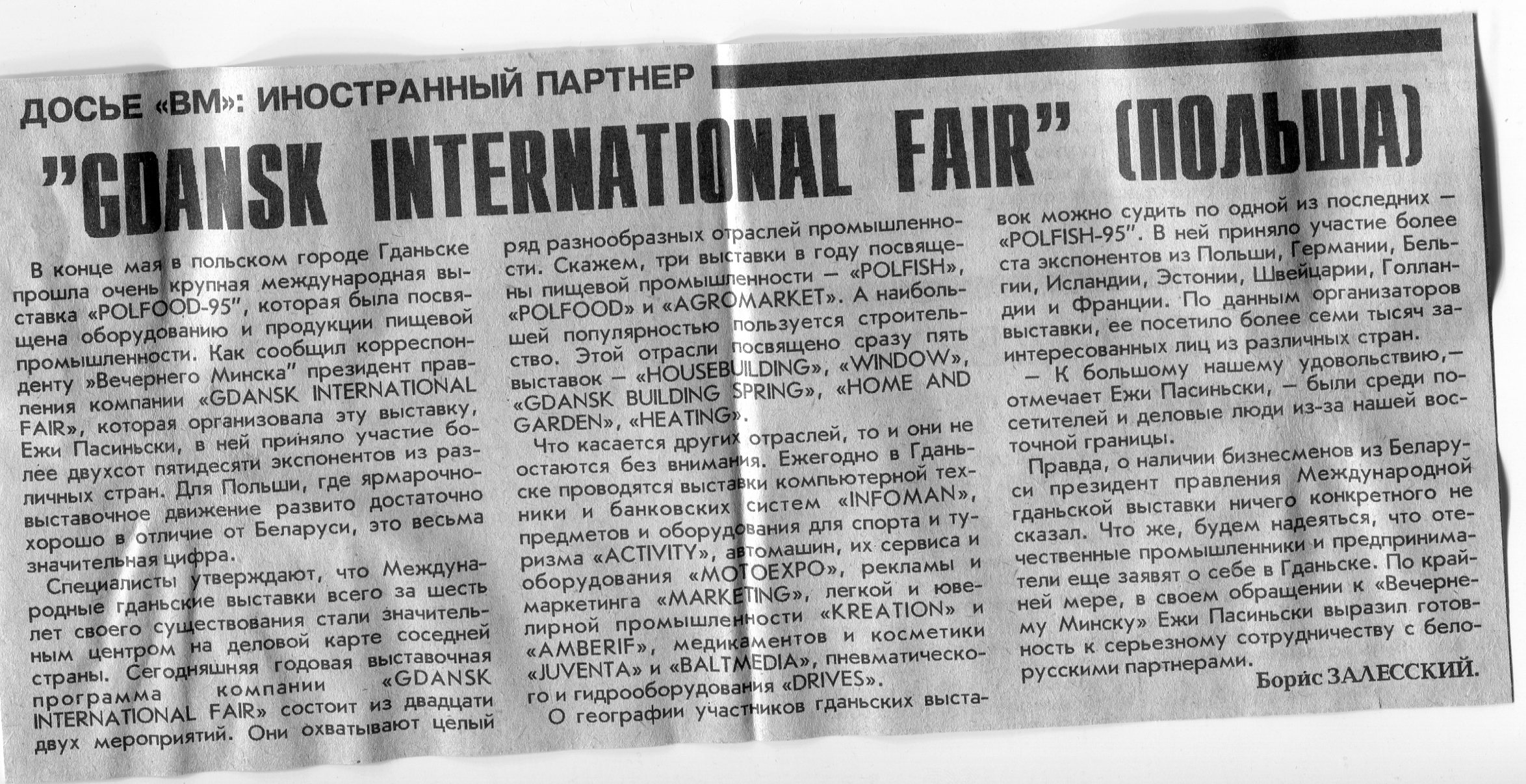 Залесский, Б. "Gdansk International Fair" (Польша) / Б. Залесский // Вечерний Минск. - 1995. - 12 июн.