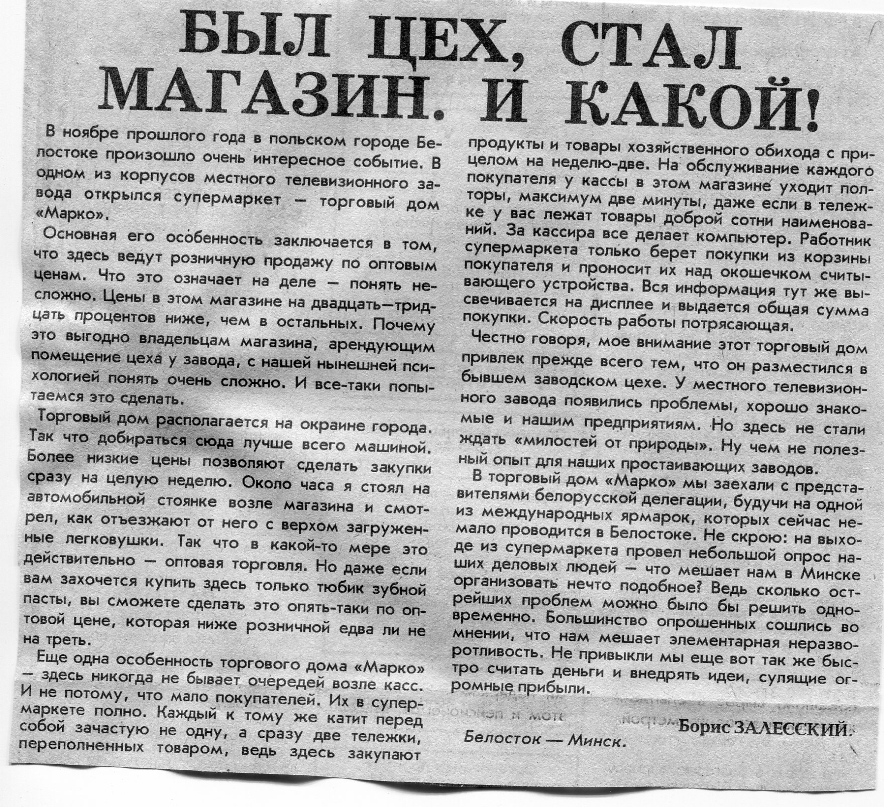 Залесский, Б. Был цех, стал магазин. И какой! / Б. Залесский // Вечерний Минск. - 1995. - 13 июн.