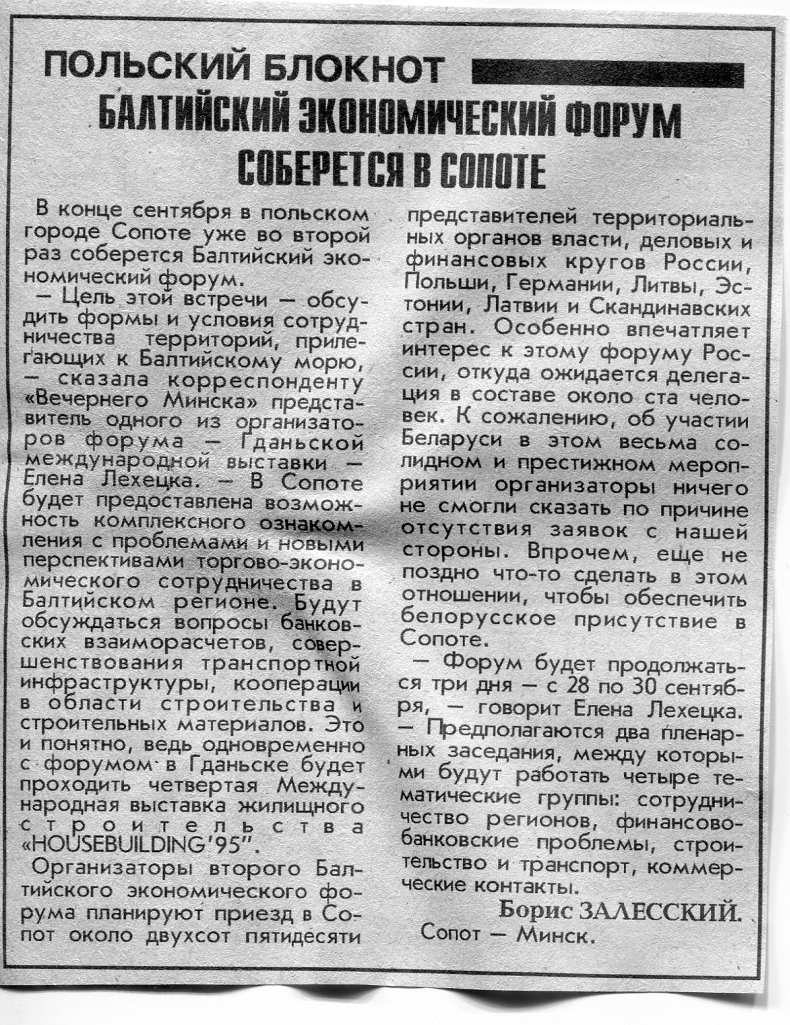 Залесский, Б. Балтийский экономический форум соберется в Сопоте / Б. Залесский // Вечерний Минск. - 1995. - 20 сент.