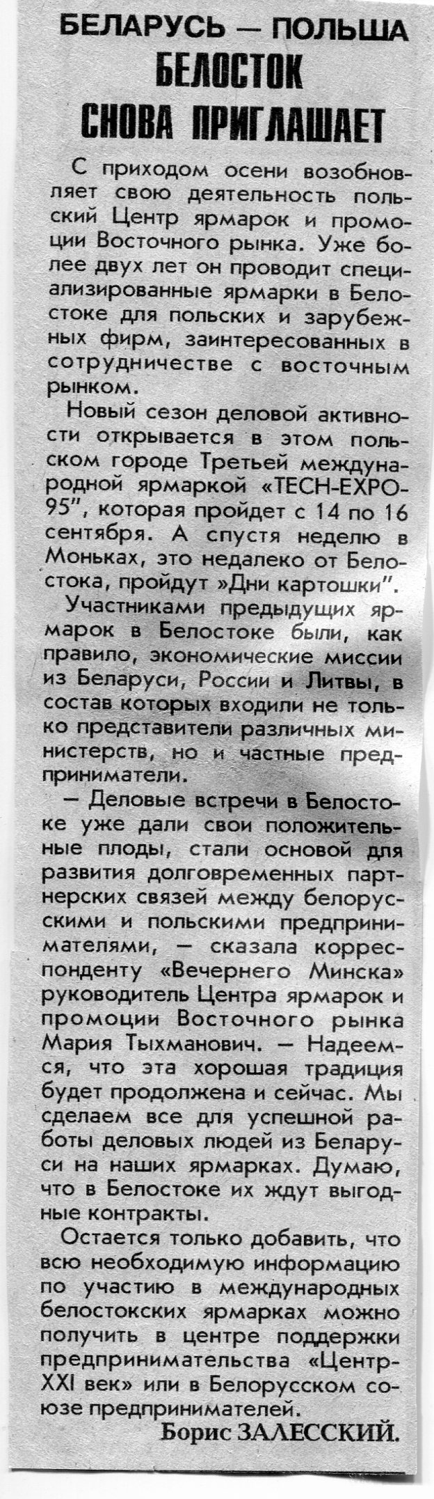 Залесский, Б. Белосток снова приглашает / Б. Залесский // Вечерний Минск. - 1995. - 11 сент.