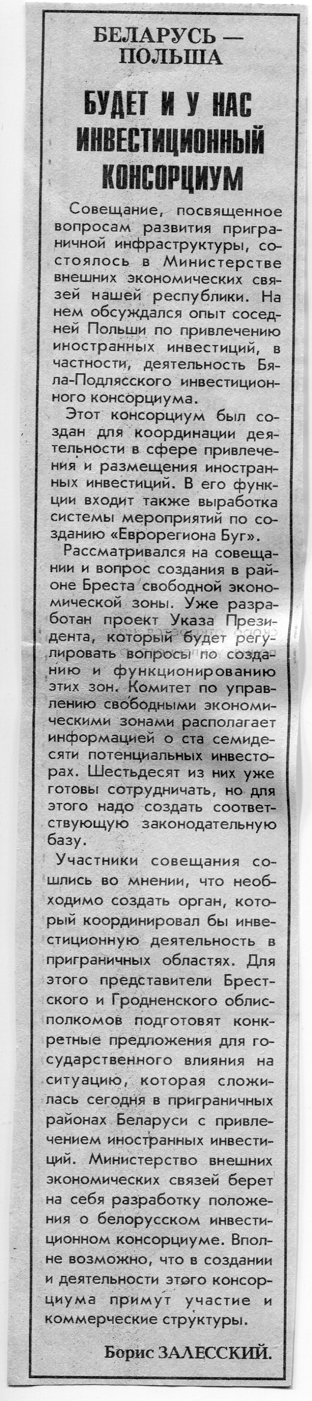 Залесский, Б. Будет и у нас инвестиционный консорциум / Б. Залесский // Вечерний Минск. - 1995. - 12 сент.