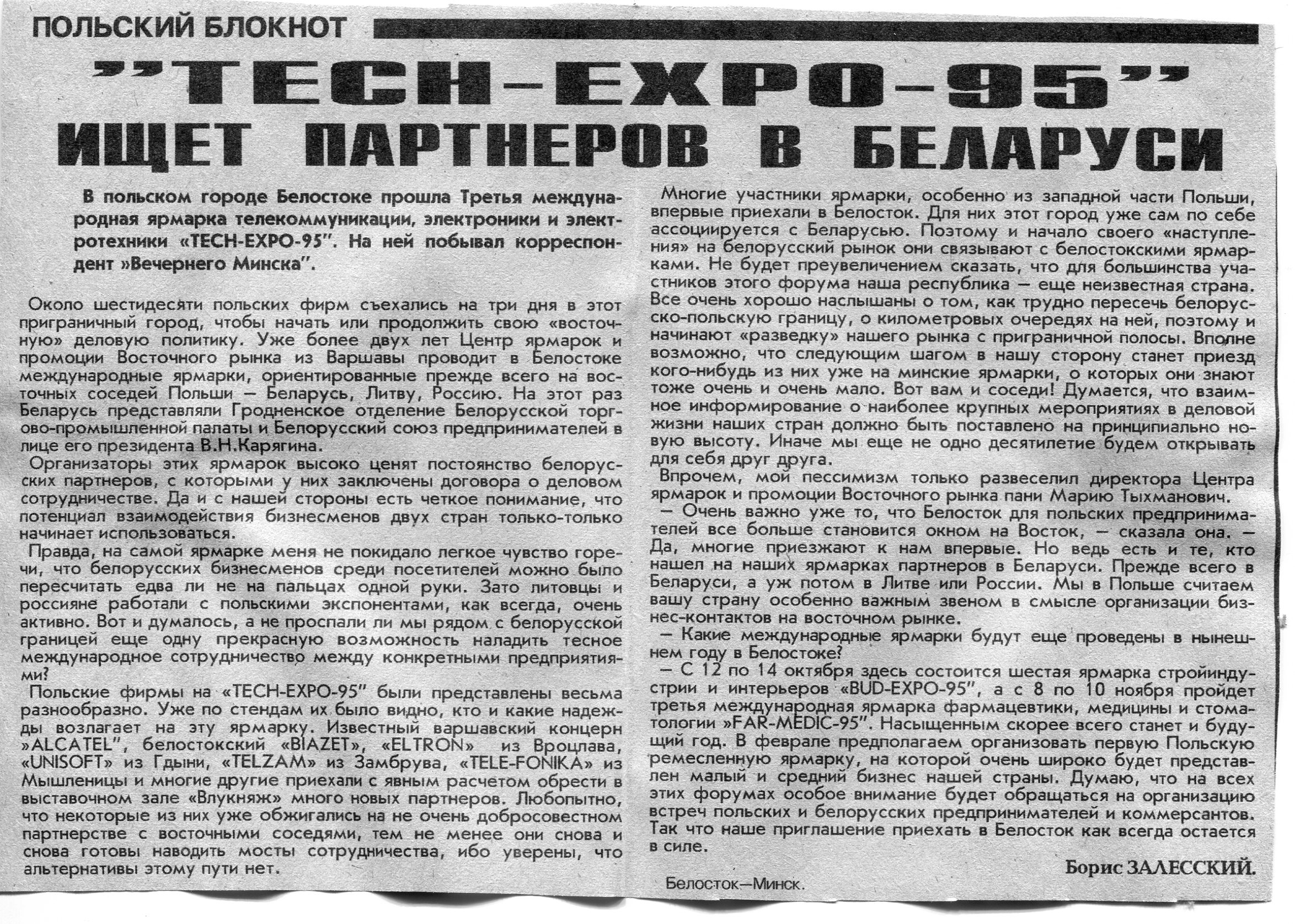 Залесский, Б. "Tech-expo-95" ищет партнеров в Беларуси / Б. Залесский // Вечерний Минск. - 1995. - 28 сент.