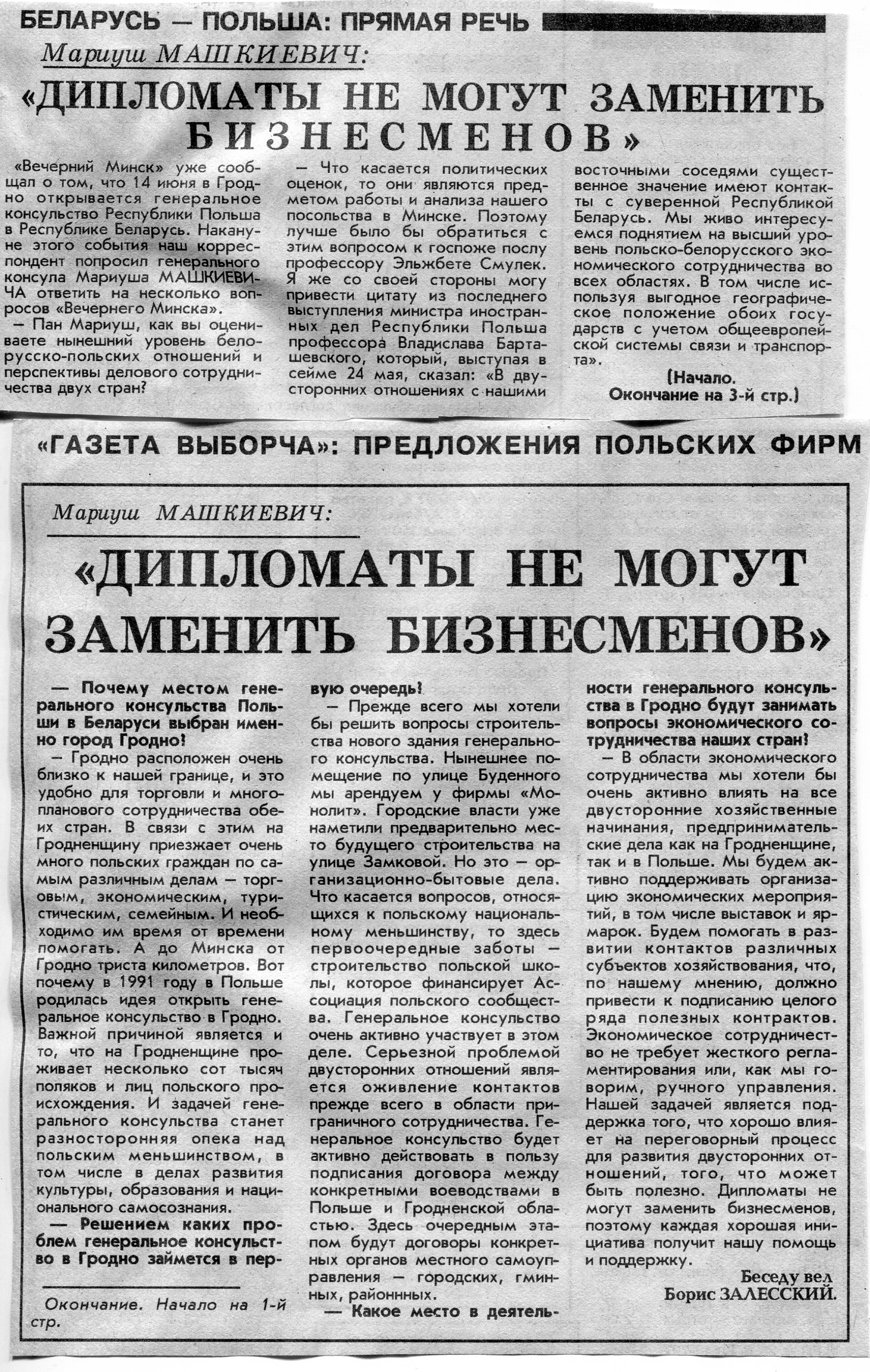 Залесский, Б. Мариуш Машкиевич: "Дипломаты не могут заменить бизнесменов" / Б. Залесский // Вечерний Минск. - 1995. - 13 июн.