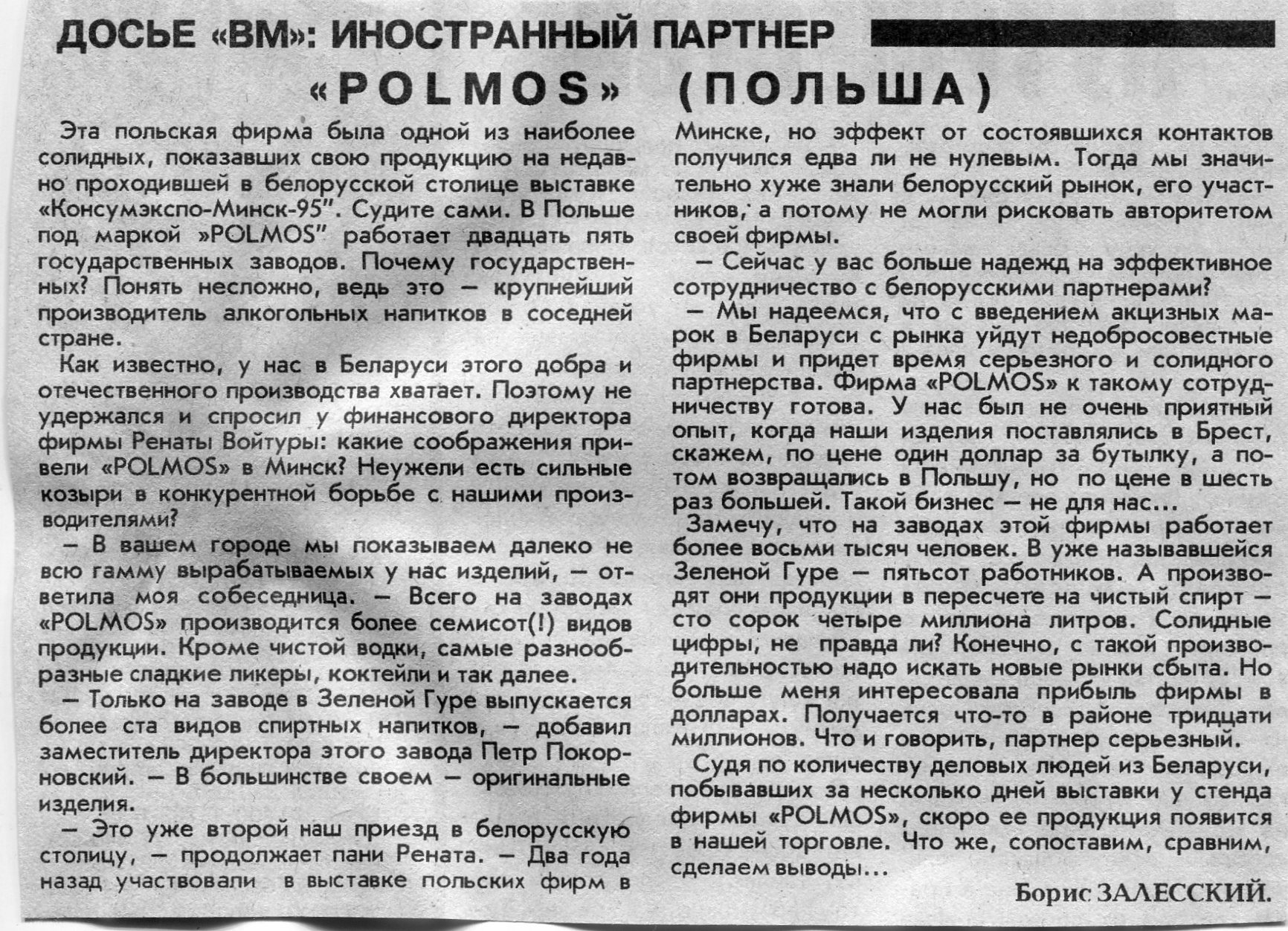 Залесский, Б. "Polmos" (Польша) / Б. Залесский // Вечерний Минск. - 1995. - 13 июн.