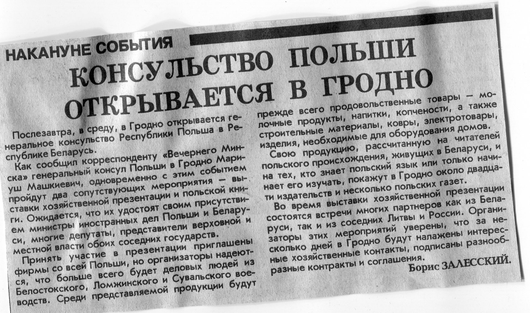Залесский, Б. Консульство Польши открывается в Гродно / Б. Залесский // Вечерний Минск. - 1995. - 12 июн.