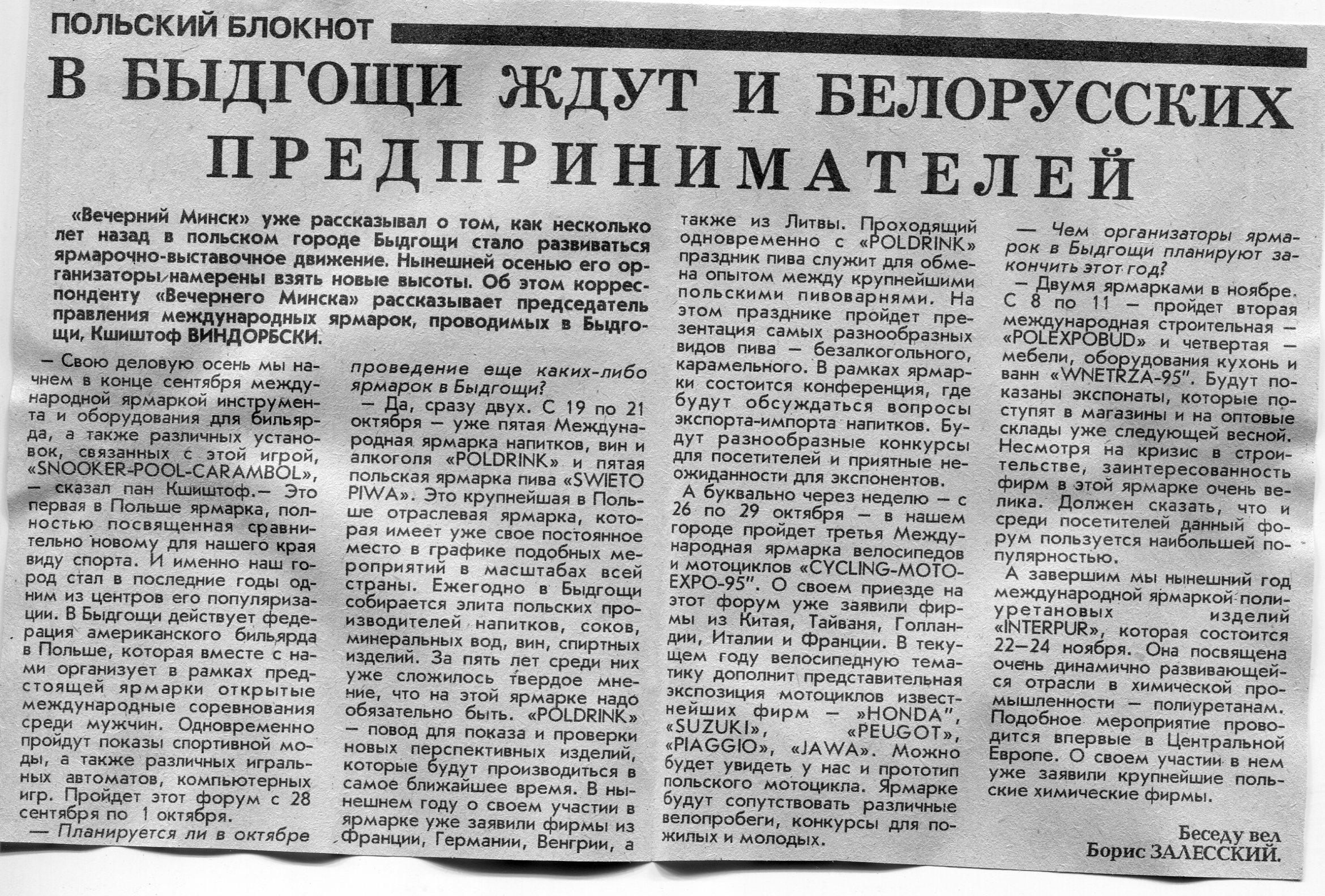 Залесский, Б. В Быдгощи ждут и белорусских предпринимателей / Б. Залесский // Вечерний Минск. - 1995. - 8 авг.