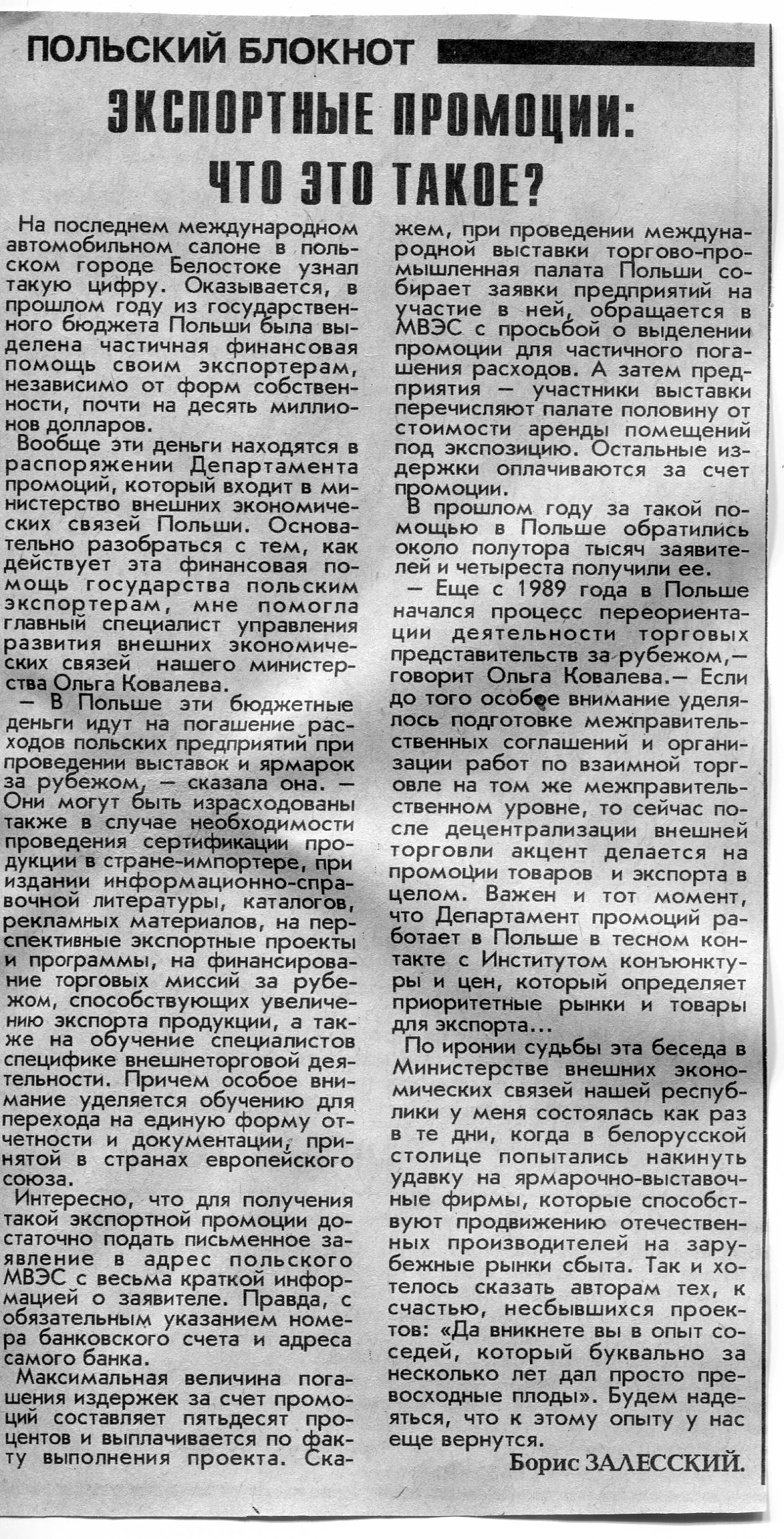 Залесский, Б. Экспортные промоции: что это такое? / Б. Залесский // Вечерний Минск. - 1995. - 1 авг.