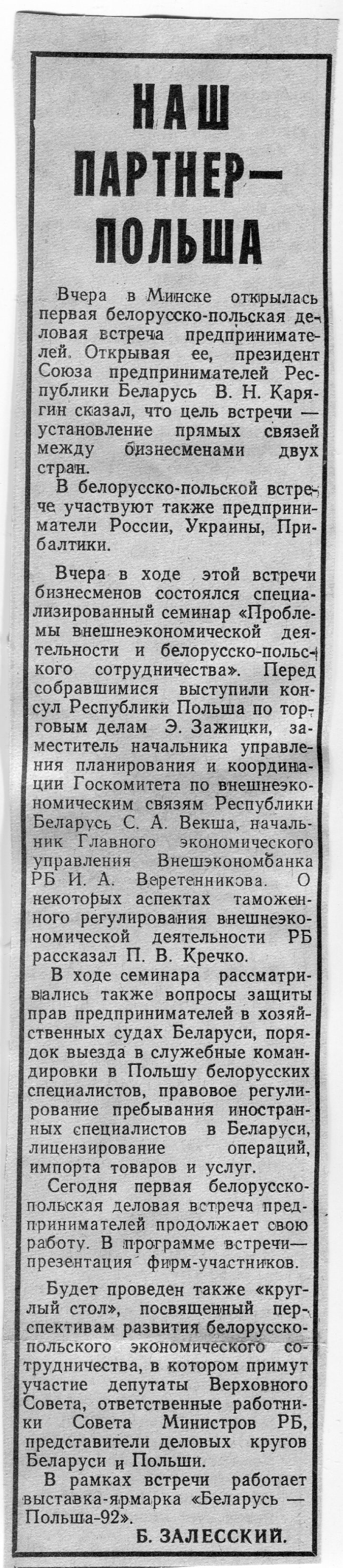 Залесский, Б. Наш партнер - Польша / Б. Залесский // Вечерний Минск. - 1992.- 22 янв.