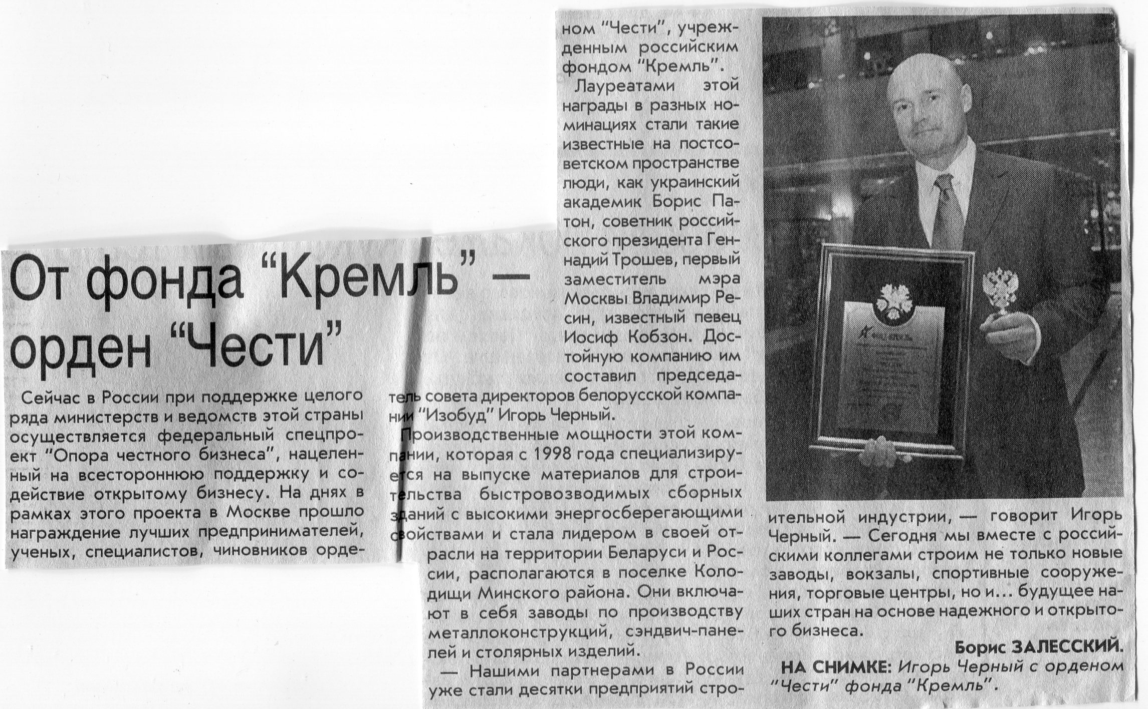 Залесский, Б. От фонда "Кремль" - орден "Чести" / Б. Залесский // Вечерний Минск. - 2008. - 10 янв.