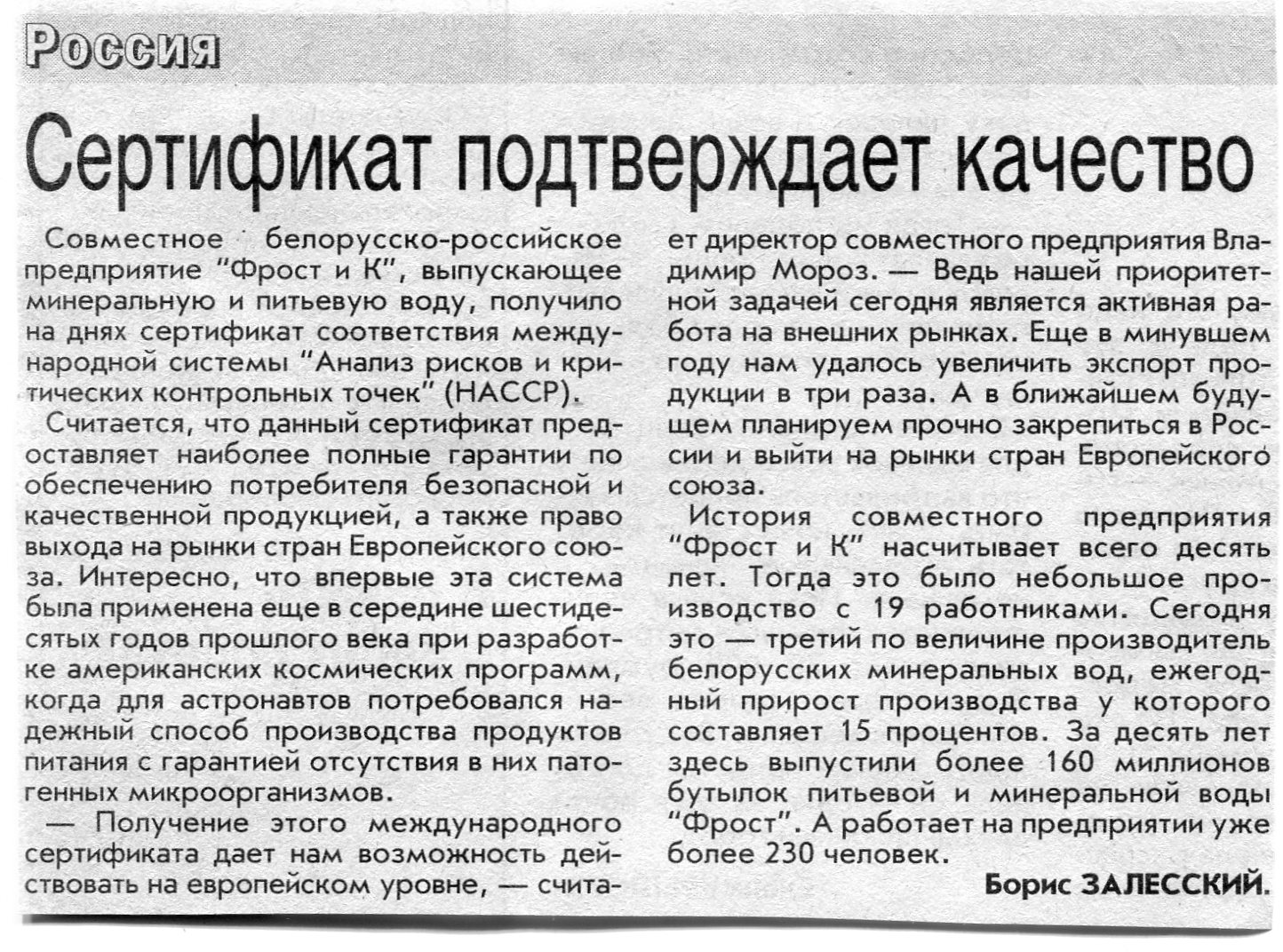 Залесский, Б. Сертфикат подтверждает качество / Б. Залесский // Вечерний Минск. - 2008. - 25 мар.