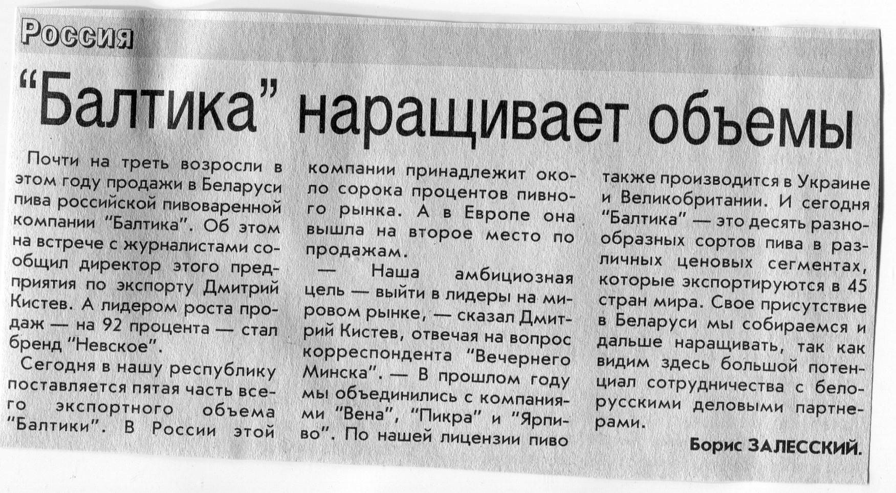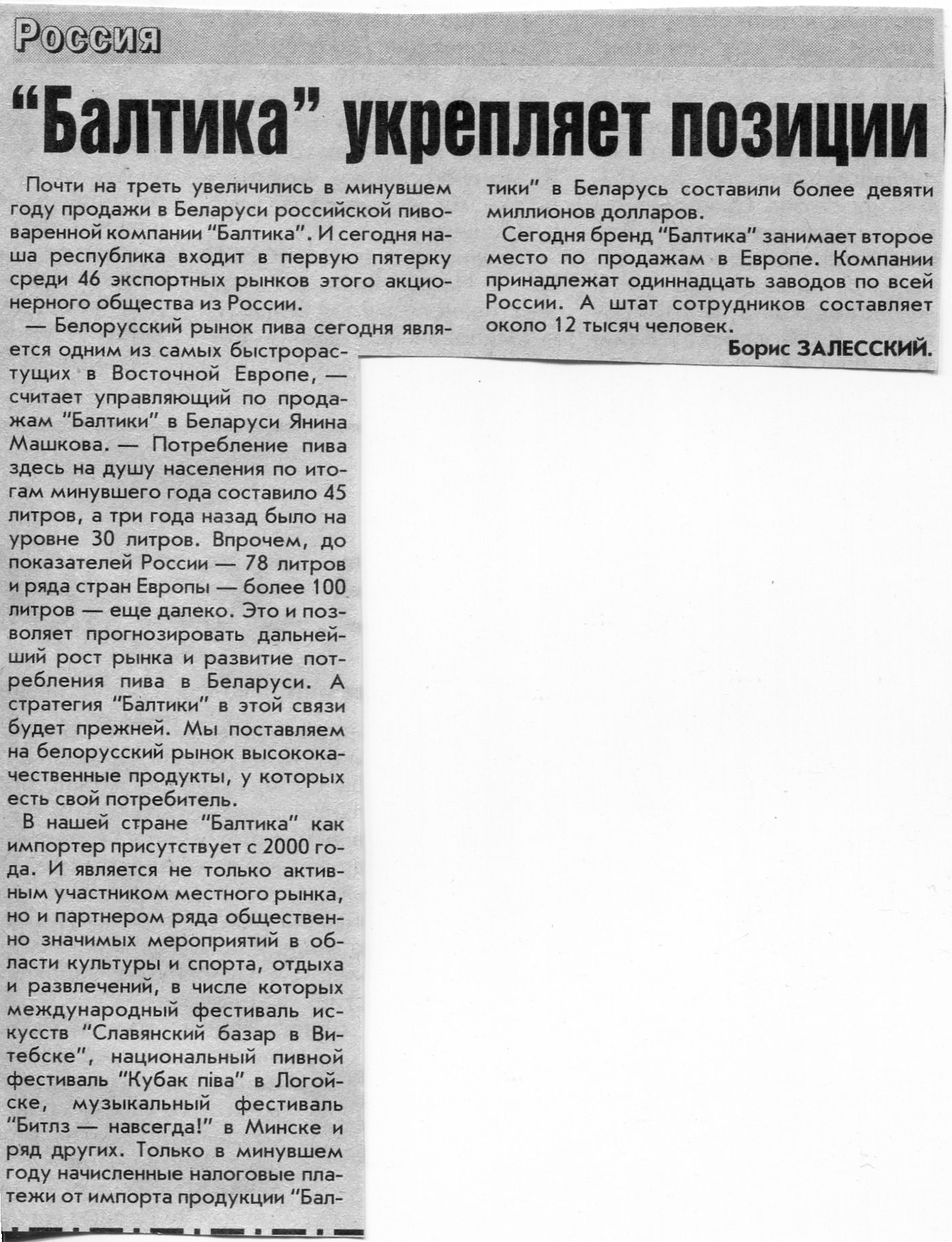 Залесский, Б. "Балтика" наращивает объемы / Б. Залесский // Вечерний Минск. - 2007. - 10 дек.