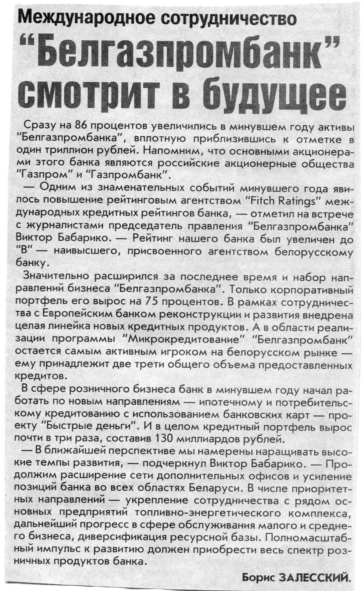 Залесский, Б. "Белгазпромбанк" смотрит в будущее / Б. Залесский // Вечерний Минск. - 2008. - 31 мар.