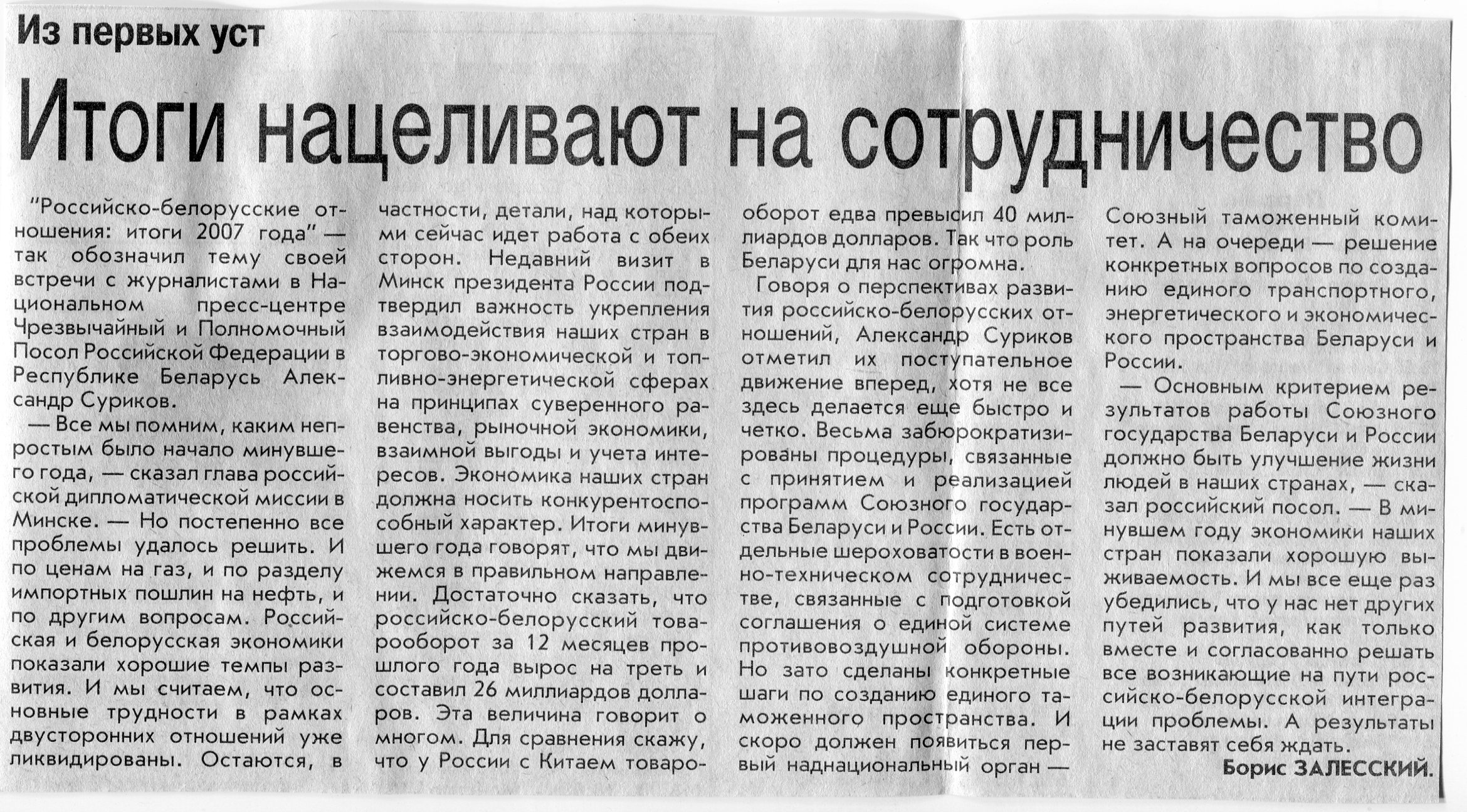 Залесский, Б. Итоги нацеливают на сотрудничество / Б. Залесский // Вечерний Минск. - 2008. - 12 февр.