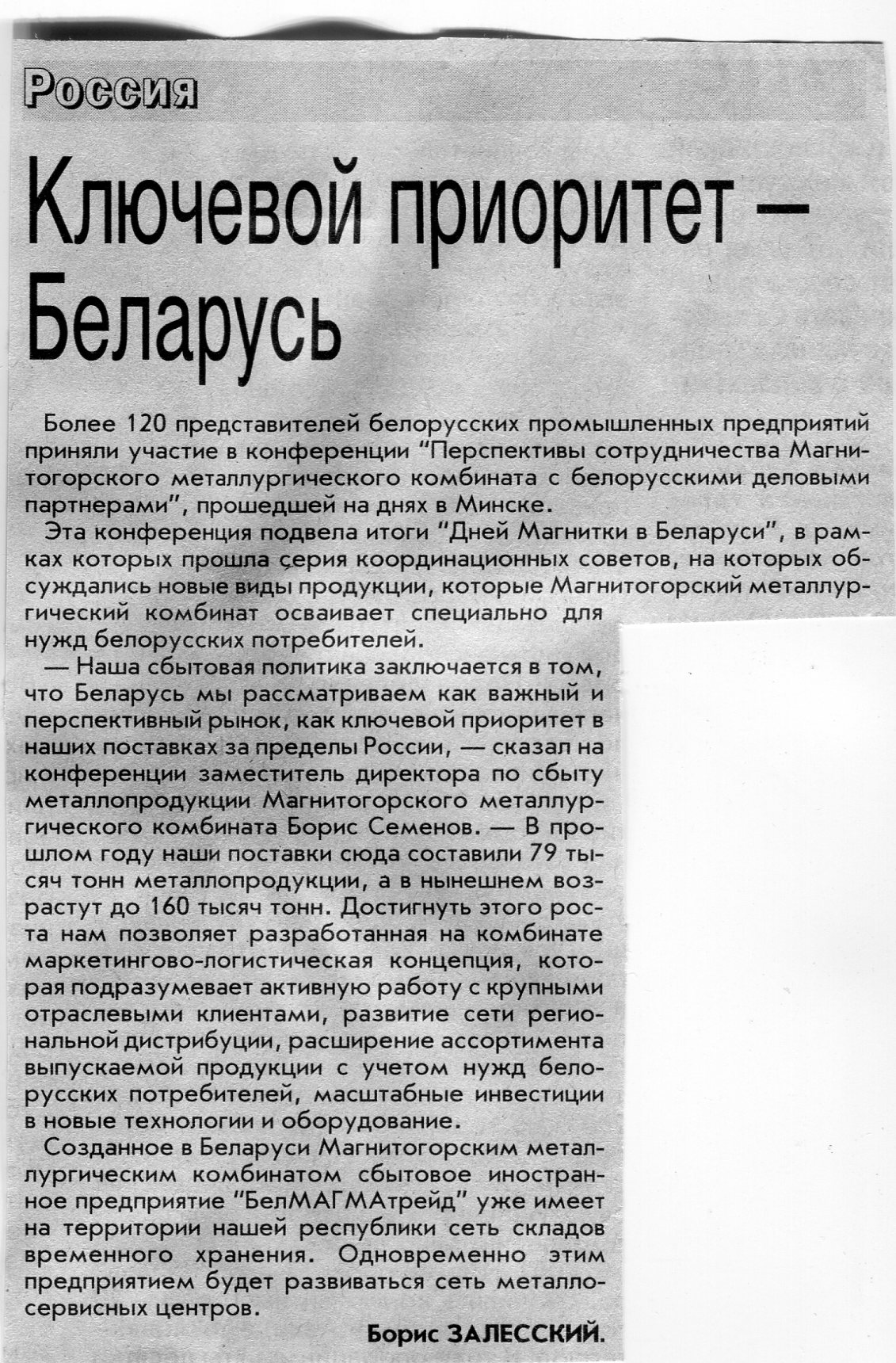 Залесский, Б. Ключевой приоритет - Беларусь / Б. Залесский // Вечерний Минск. - 2007. - 19 нояб.