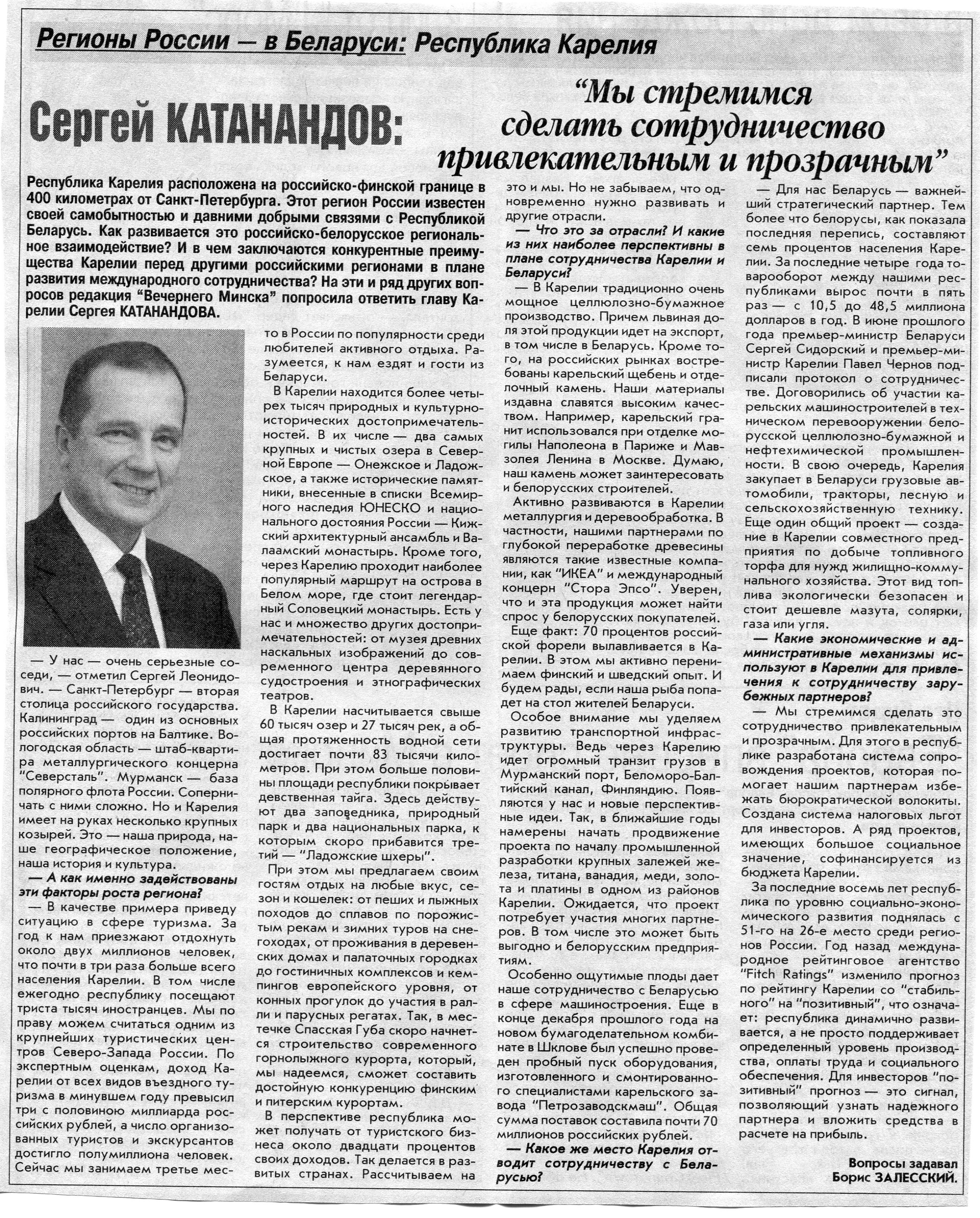 Залесский, Б. Сергей Катанандов: "Мы стремимся сделать сотрудничество привлекательным и прозрачным" / Б. Залесский // Вечерний Минск. - 2008. - 24 мар.