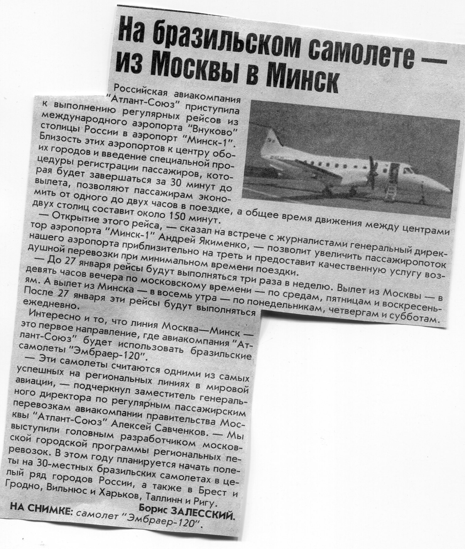 Залесский, Б. На бразильском самолете - из Москвы в Минск / Б. Залесский // Вечерний Минск. - 2008. - 11 янв.