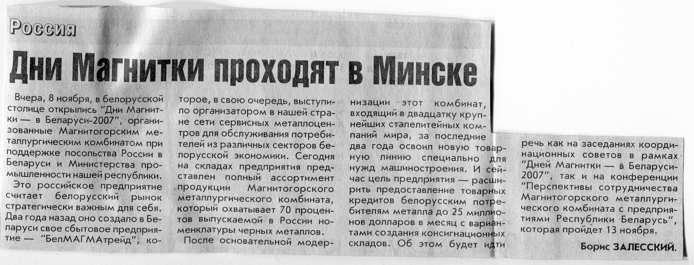 Залесский, Б. Дни Магнитки проходят в Минске / Б. Залесский // Вечерний Минск. - 2007. - 9 нояб.
