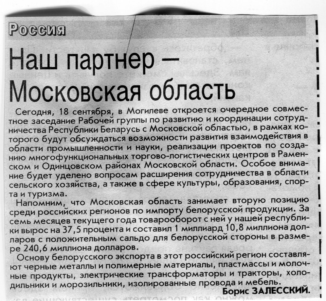 Залесский, Б. Наш партнер - Московская область / Б. Залесский // Вечерний Минск. - 2007. - 18 сент.