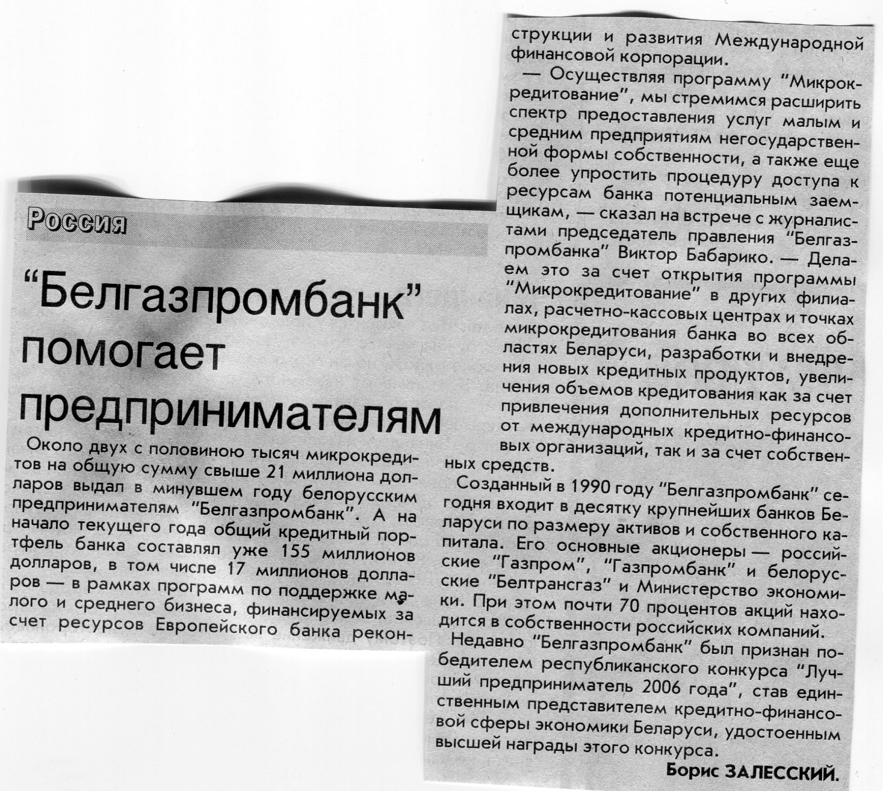 Залесский, Б. "Белгазпромбанк" помогает предпринимателям / Б. Залесский // Вечерний Минск. - 2007. - 6 авг.