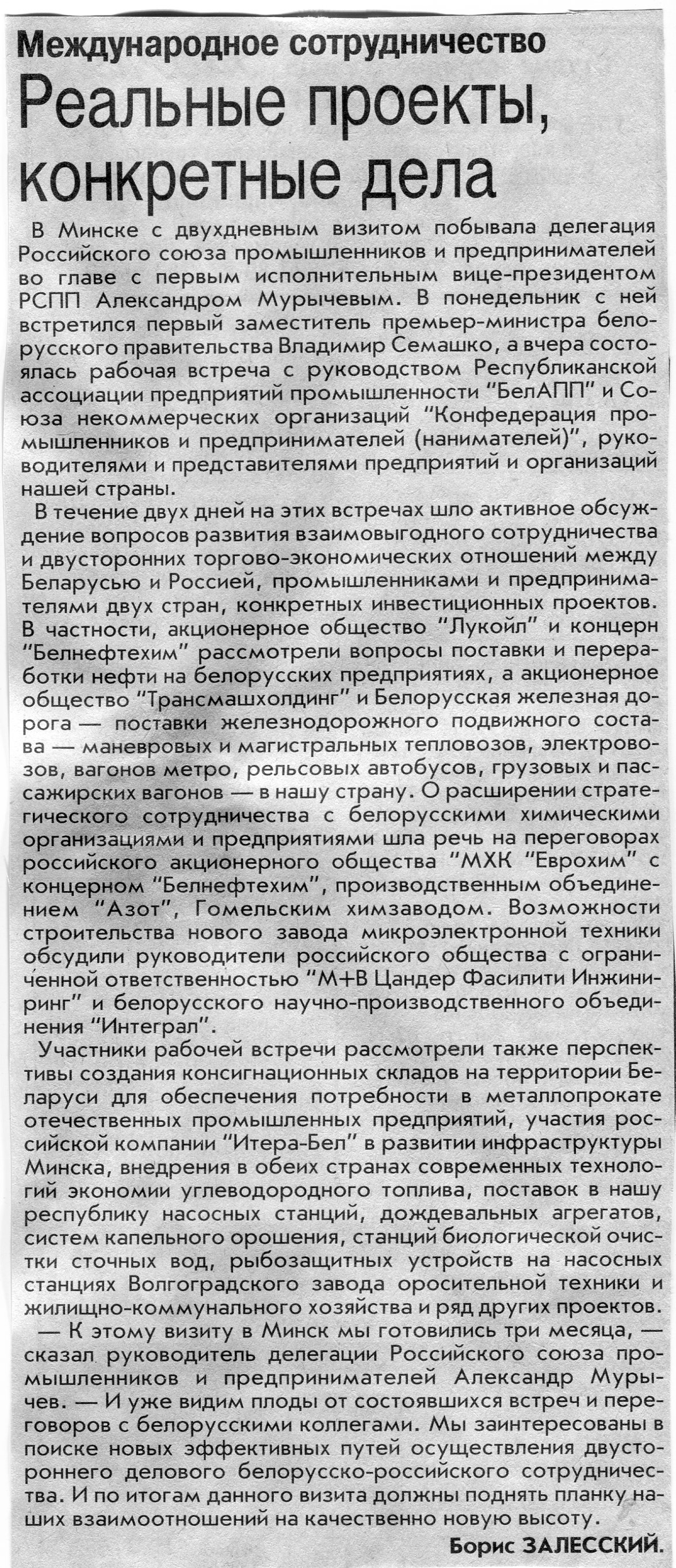 Залесский, Б. Реальные проекты, конкретные дела / Б. Залесский // Вечерний Минск. - 2007. - 26 сент.