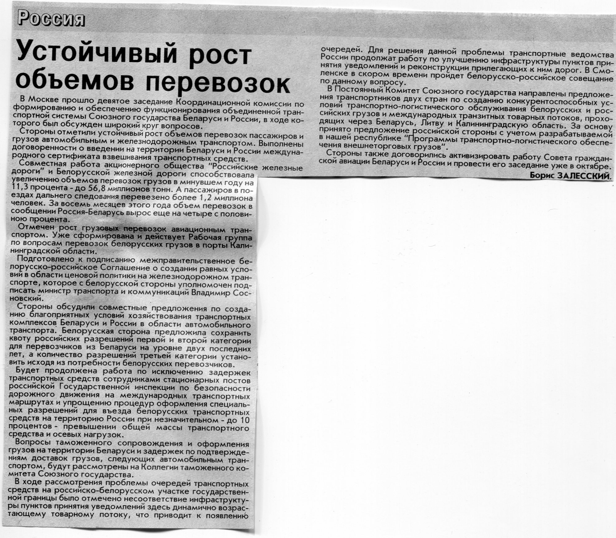 Залесский, Б. Устойчивый рост объемов перевозок / Б. Залесский // Вечерний Минск. - 2007. - 27 сент.