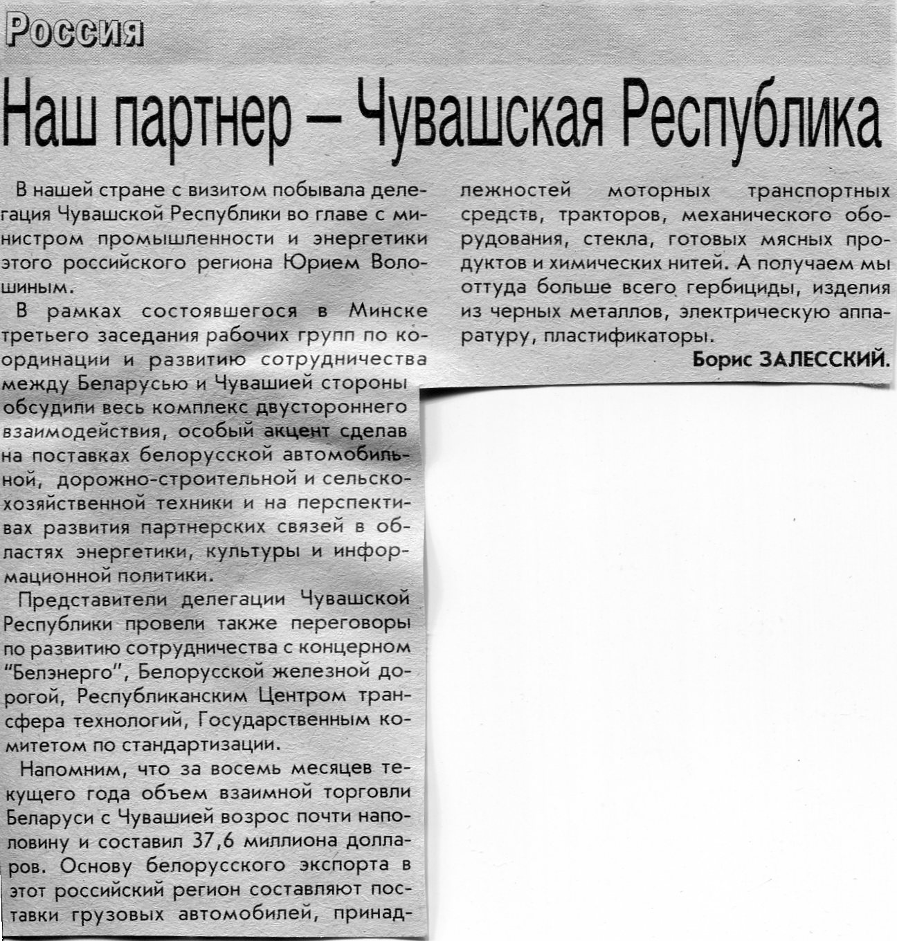 Залесский, Б. Наш партнер - Чувашская Республика / Б. Залесский // Вечерний Минск. - 2007. - 1 нояб.