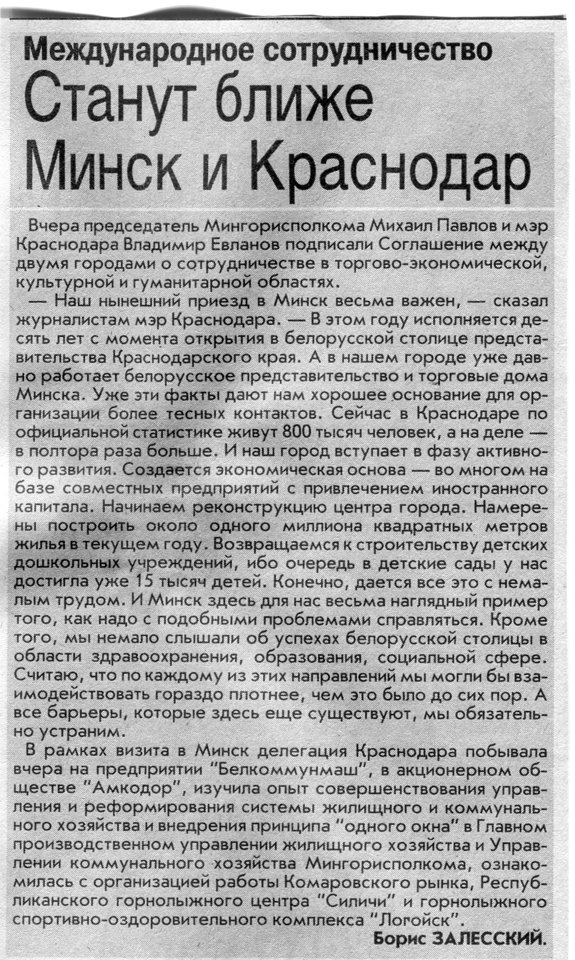 Залесский, Б. Станут ближе Минск и Краснодар / Б. Залесский // Вечерний Минск. - 2007. - 27 июн.