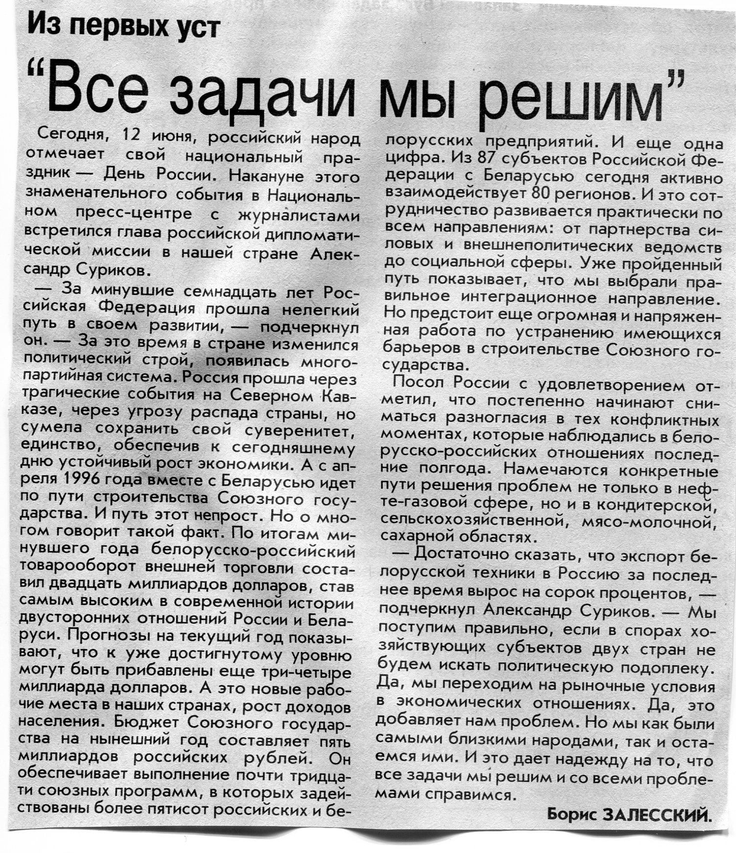 Залесский, Б. "Все задачи мы решим" / Б. Залесский // Вечерний Минск. - 2007. - 12 июн.