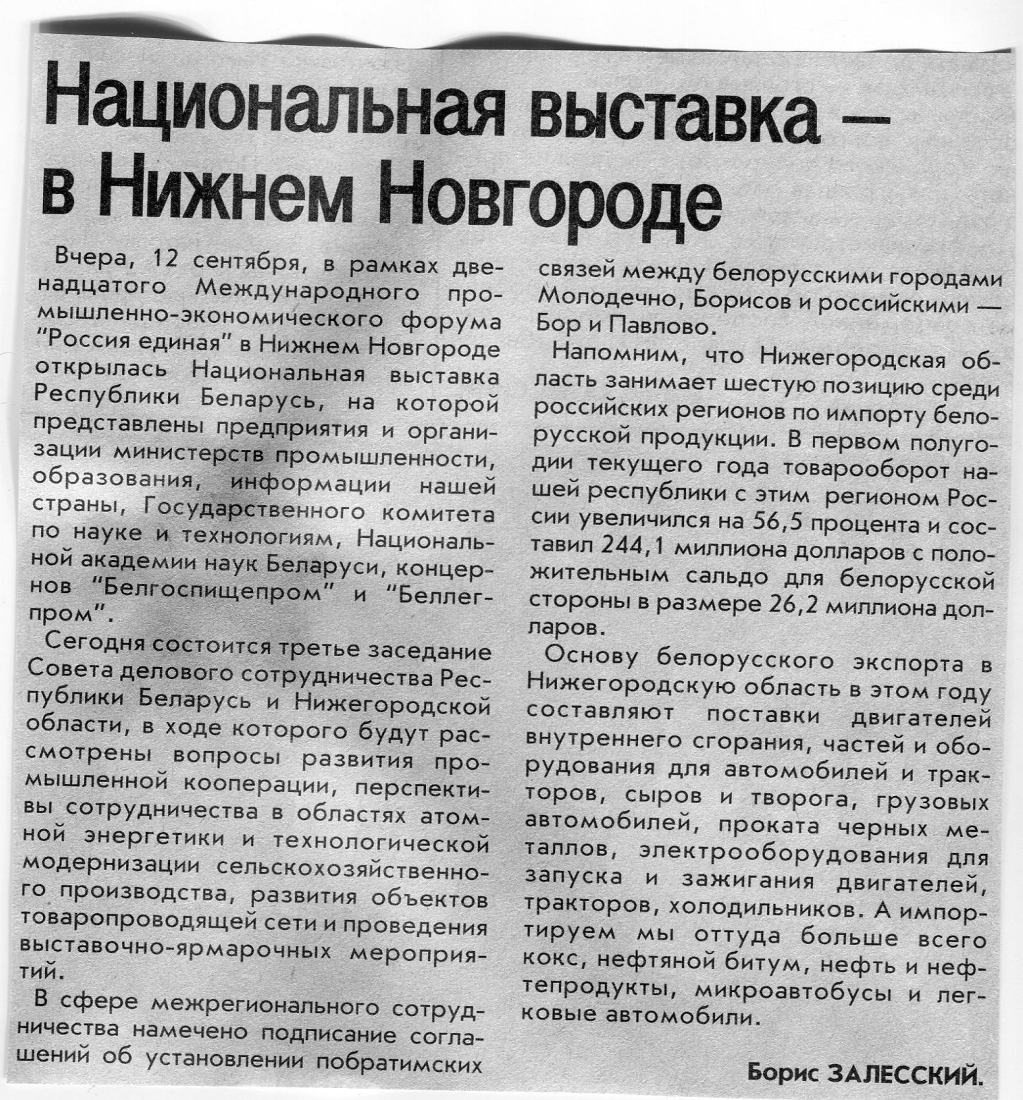 Залесский, Б. Национальная выставка - в Нижнем Новгороде / Б. Залесский // Вечерний Минск. - 2007. - 13 сент.
