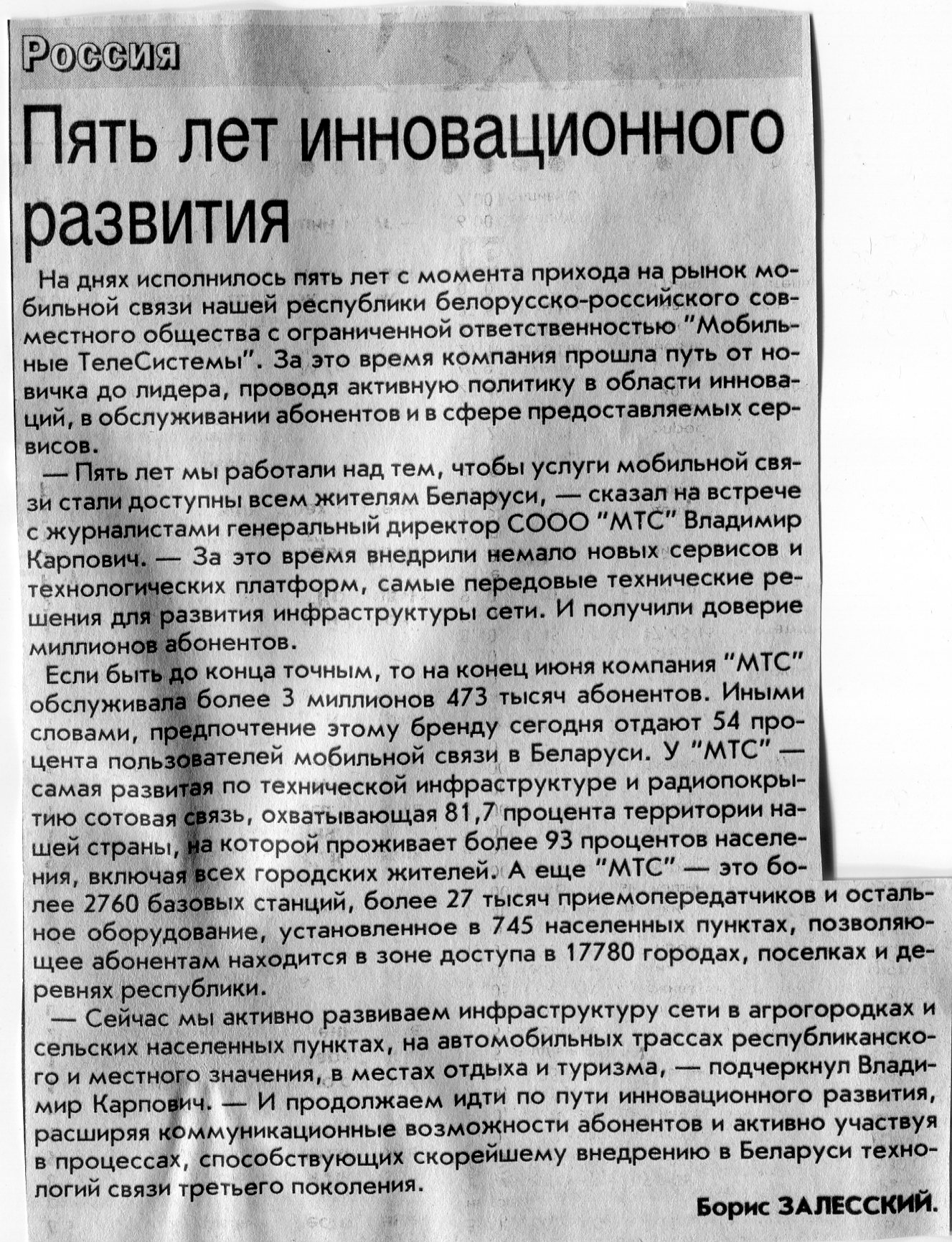 Залесский, Б. Пять лет инновационного развития / Б. Залесский // Вечерний Минск. - 2007. - 6 июл.