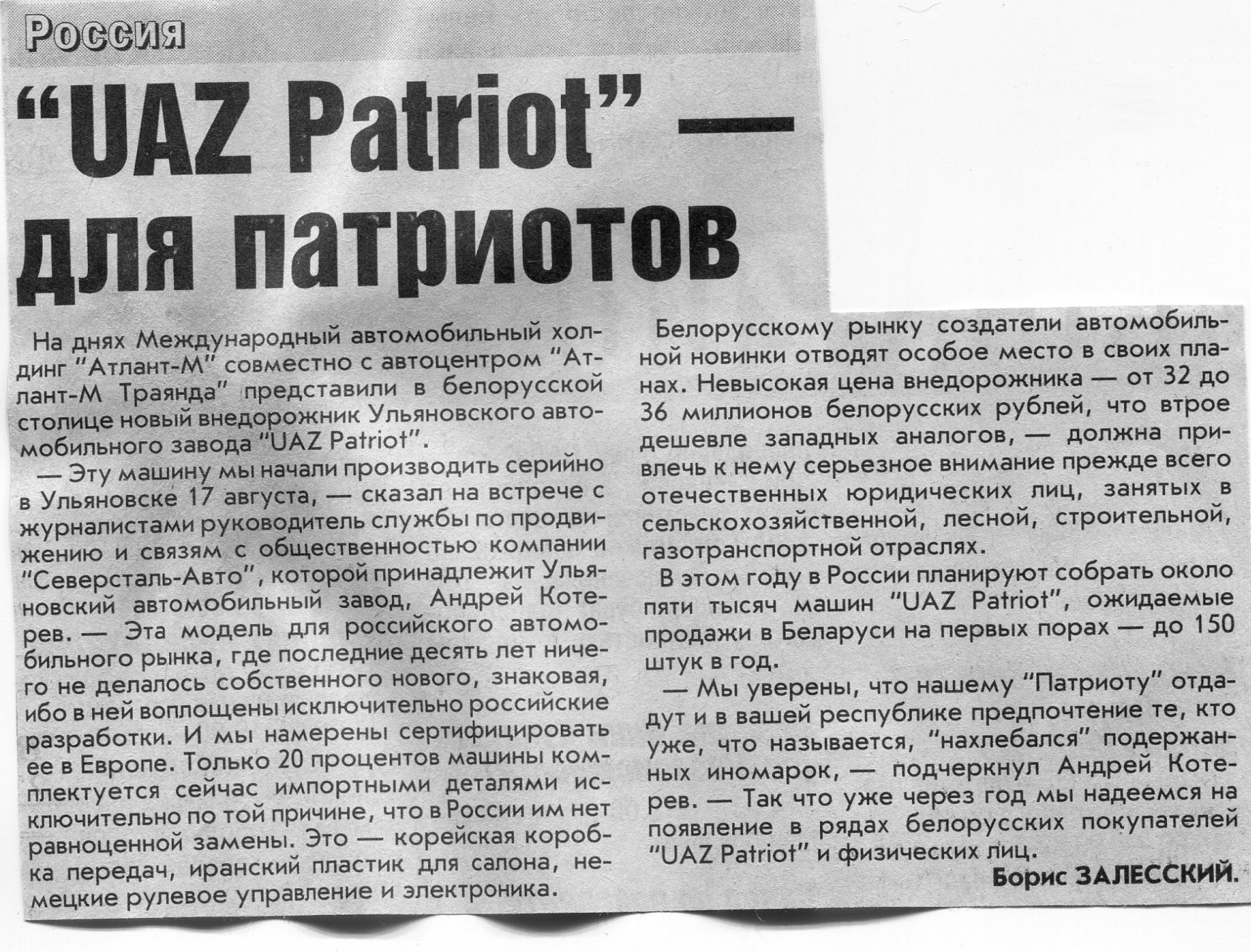Залесский, Б. "UAZ Patriot" - для патриотов / Б. Залесский // Вечерний Минск. - 2005. - 9 сент.