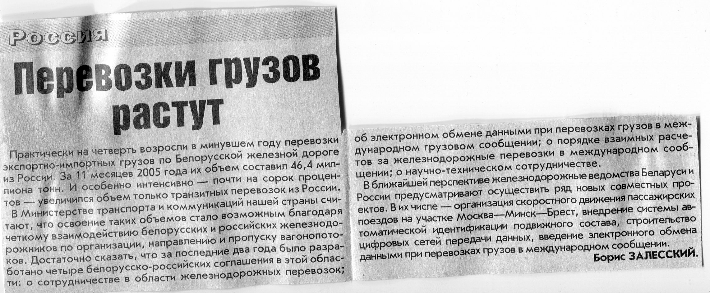 Залесский, Б. Перевозки грузов растут / Б. Залесский // Вечерний Минск. - 2006. - 20 янв.