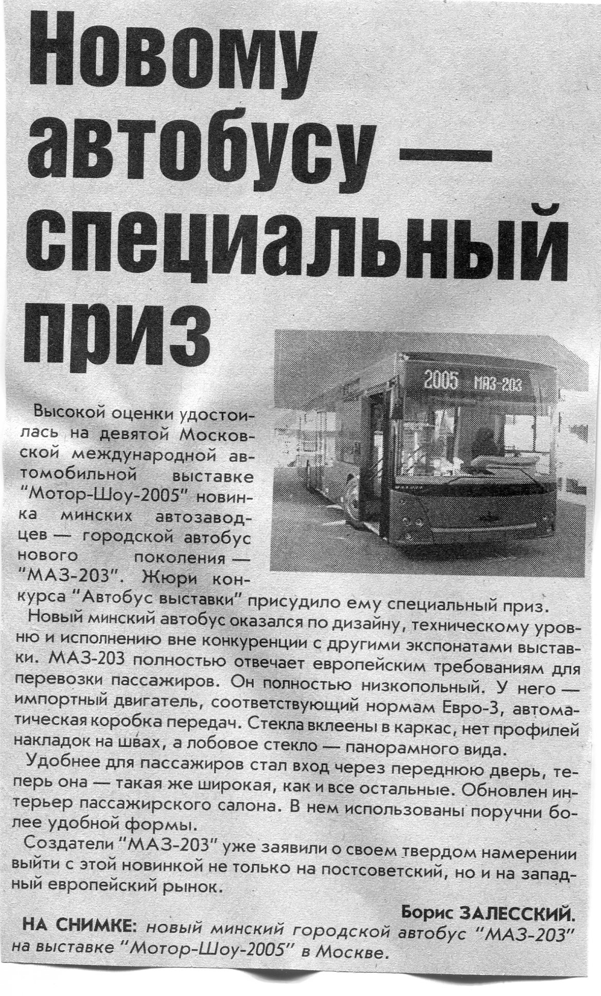 Залесский, Б. Новому автобусу - специальный приз / Б. Залесский // Вечерний Минск. - 2005. - 1 сент..