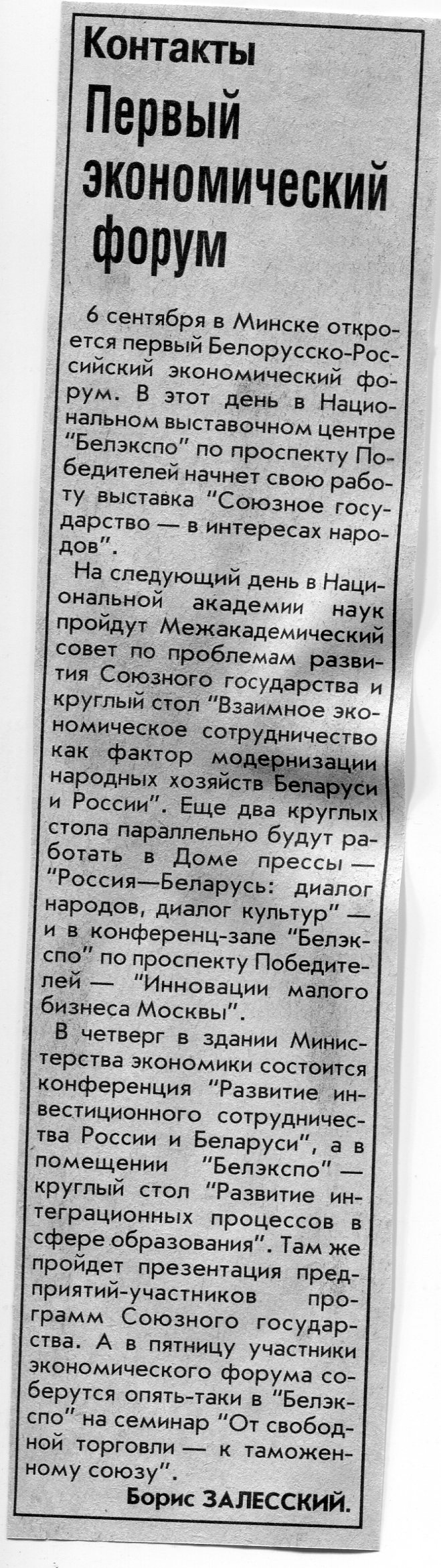 Залесский, Б. Первый экономический форум / Б. Залесский // Вечерний Минск. - 2005. - 29 авг.