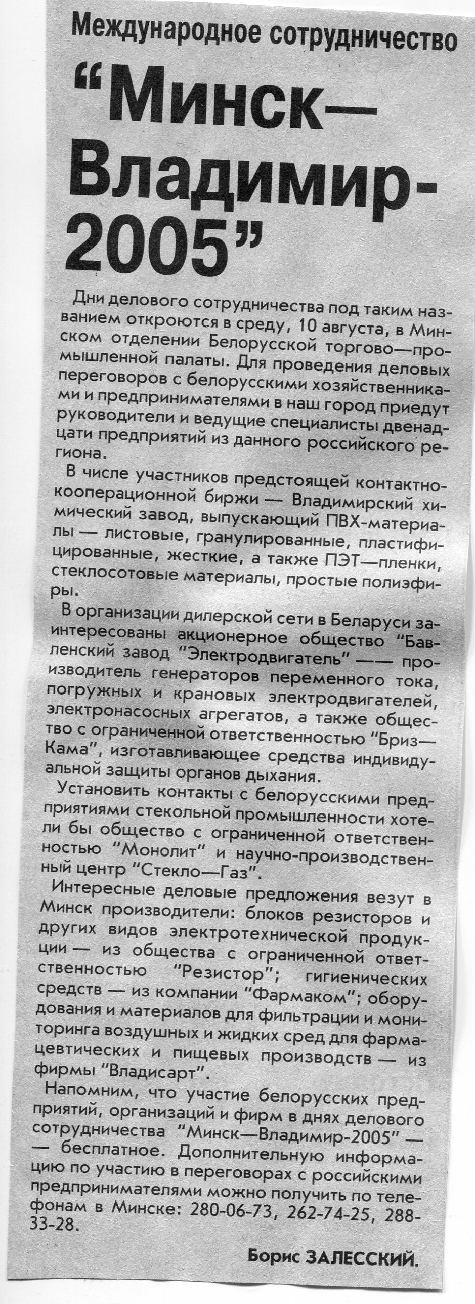 Залесский, Б. Для продвижения продукции и услуг / Б. Залесский // Вечерний Минск. - 2005. - 2 сент.