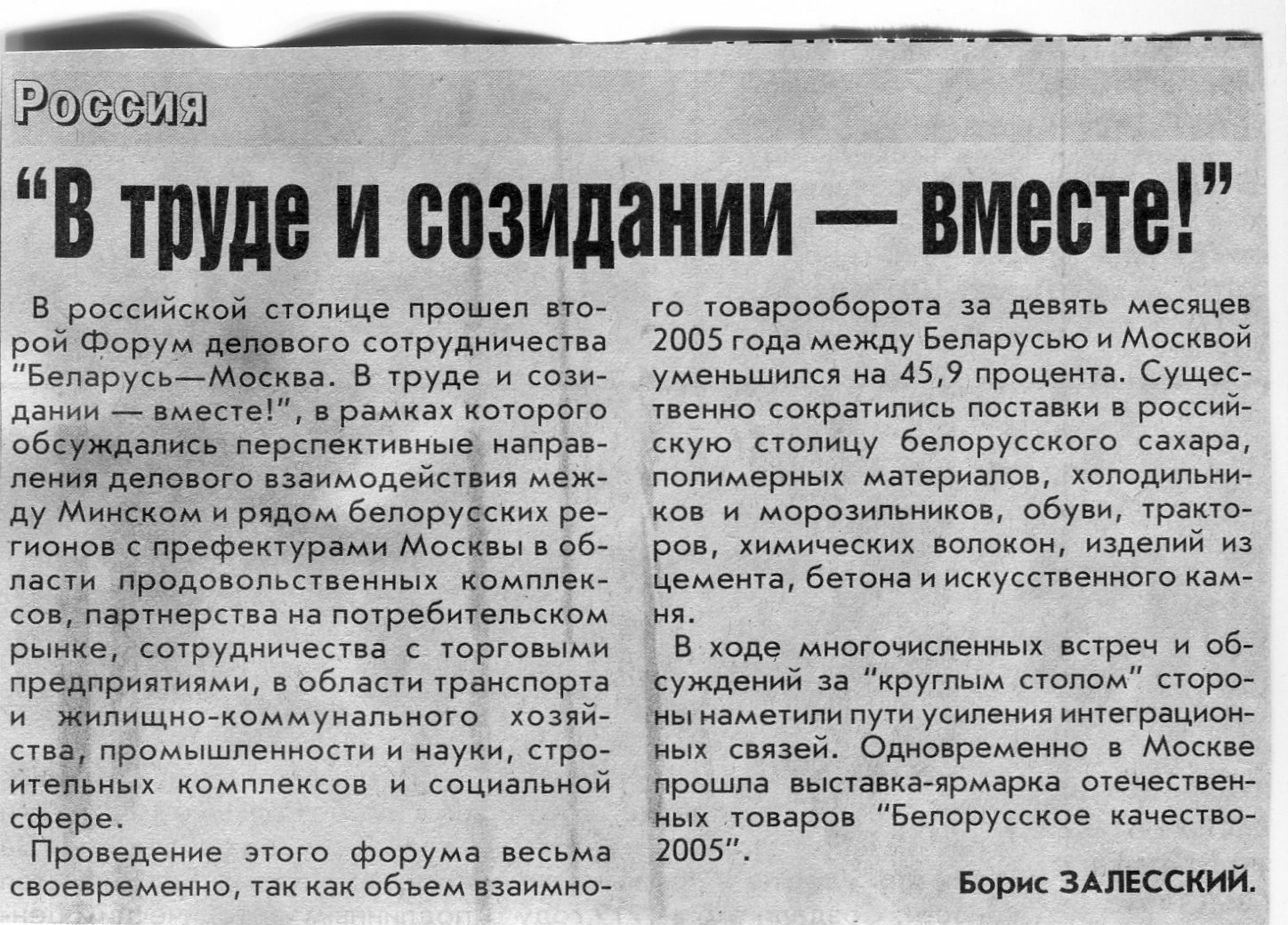 Залесский, Б. "В труде и созидании - вместе!" / Б. Залесский // Вечерний Минск. - 2006. - 9 янв.