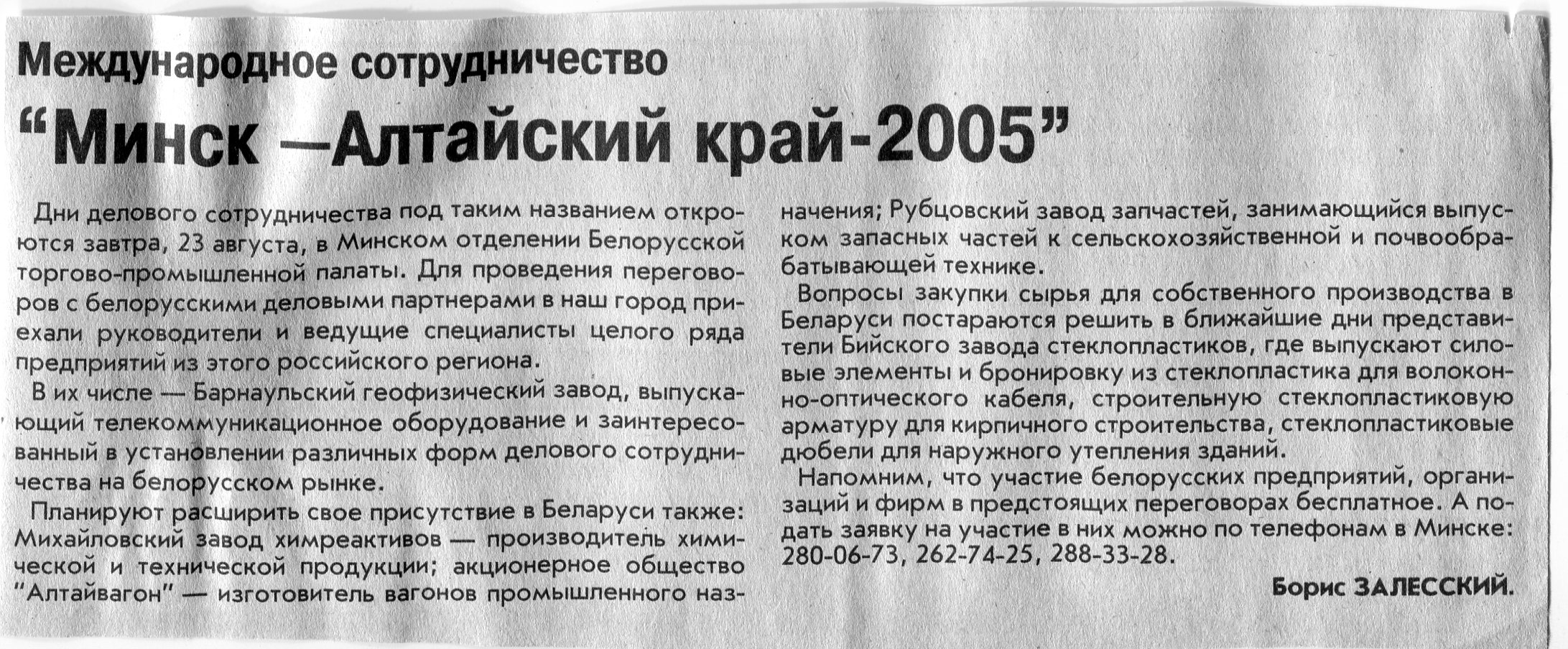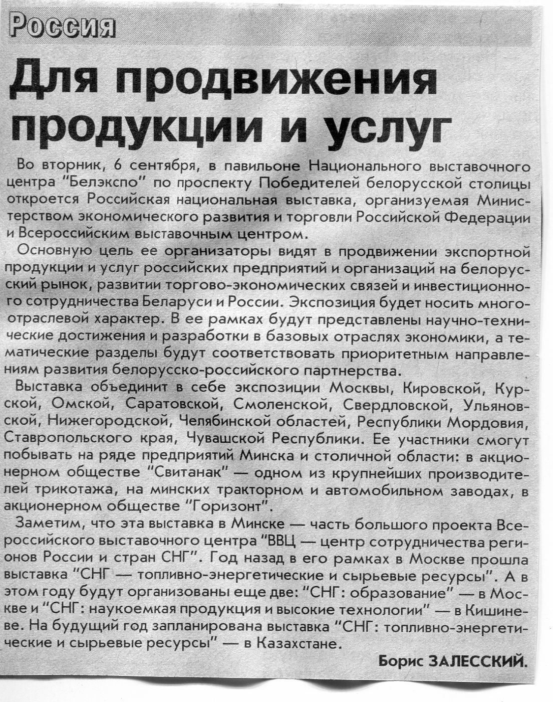 Залесский, Б. Сотрудничество прирастает регионами / Б. Залесский // Вечерний Минск. - 2005. - 8 сент.