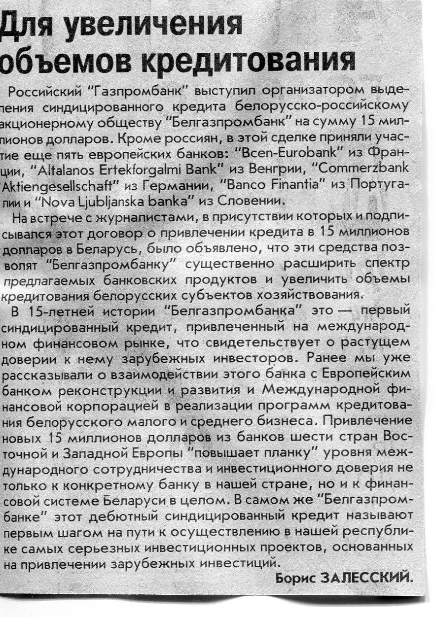 Залесский, Б. Для увеличения объемов кредитования / Б. Залесский // Вечерний Минск. - 2005. - 28 нояб.