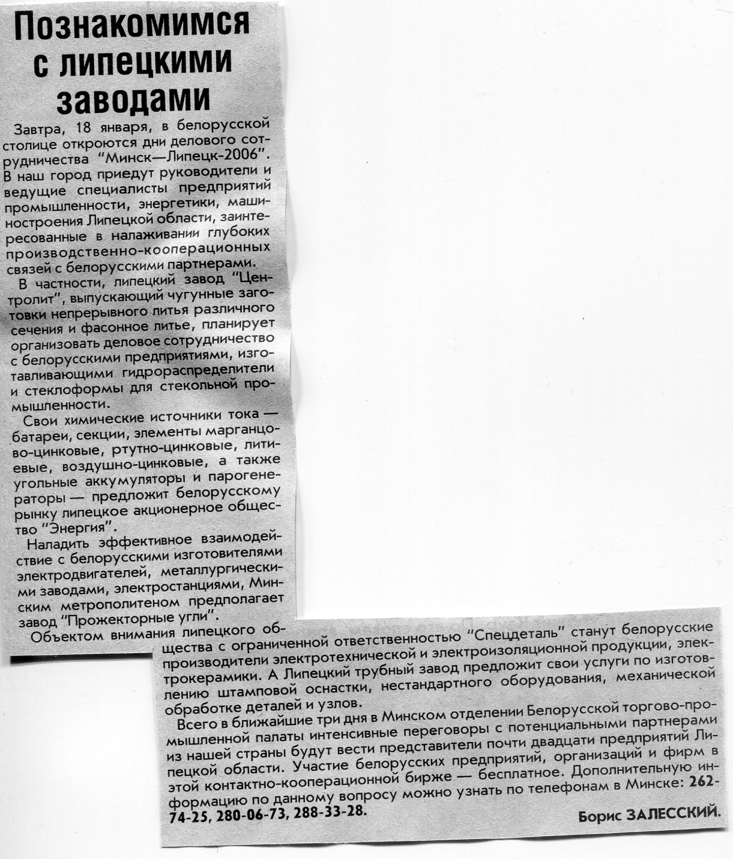 Залесский, Б. Познакомимся с липецкими заводами / Б. Залесский // Вечерний Минск. - 2006. - 17 янв.